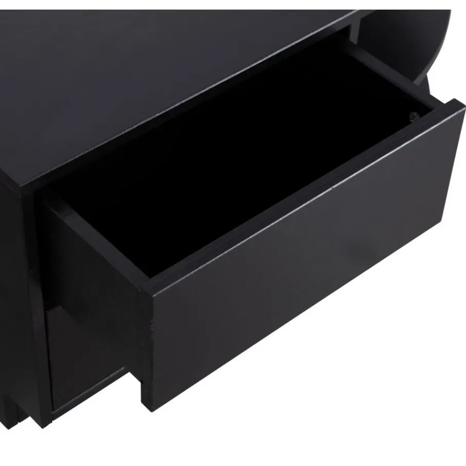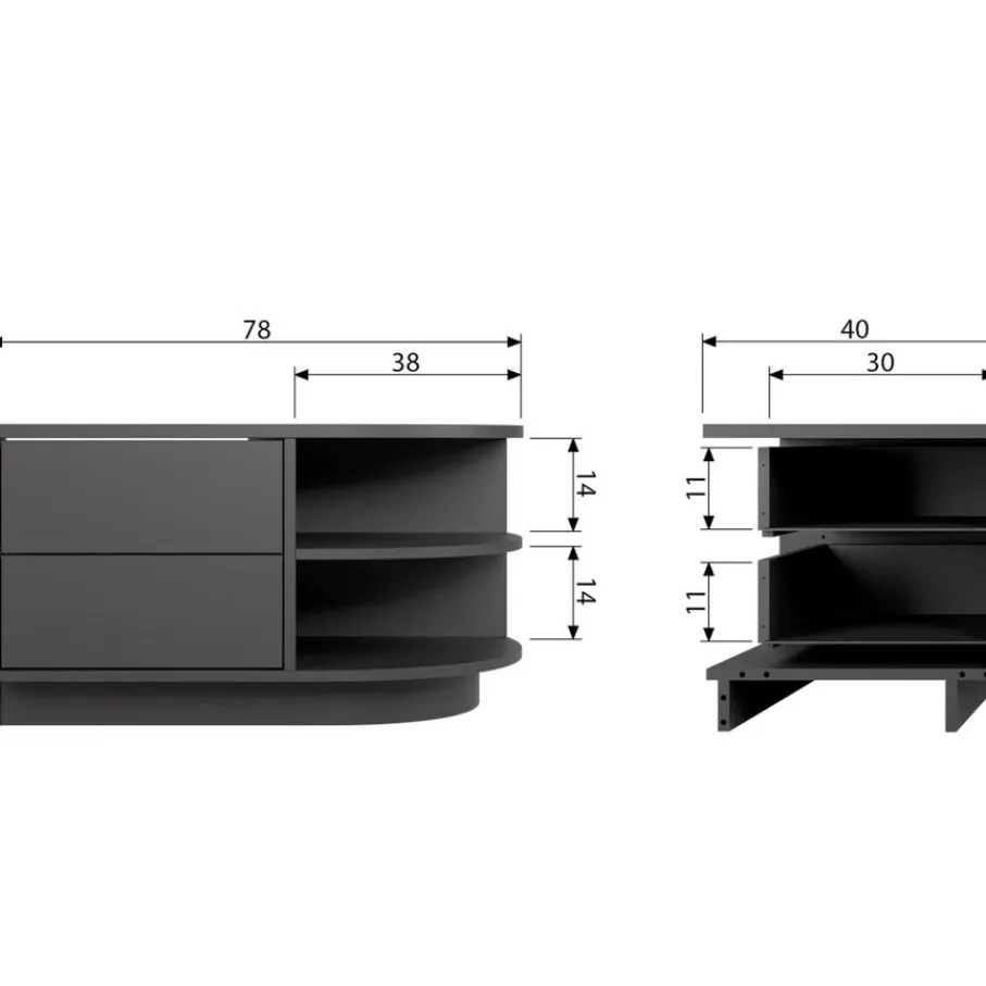 Het Finca tv meubel heeft 2 greeploze lades, deze zijn voorzien van een luxe push-to-open systeem. Iedere lade heeft een draagkracht van maximaal 10 kg wanneer het gewicht gelijkwaardig verspreid is. Aan de rechterkant zit het halfronde gedeelte met open vakken. De onderrand van het Finca tv meubel laat aan de voorzijde 7 cm ruimte, hierdoor lijkt het alsof het meubel zweeft. Dit oogt ruimtelijk en slank in je interieur.
