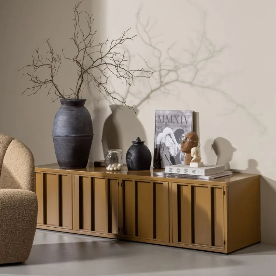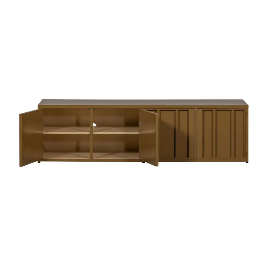 - Geef je interieur direct een warme en stijlvolle upgrade met dit unieke tv-meubel van metaal in een aardse honinggele tint.