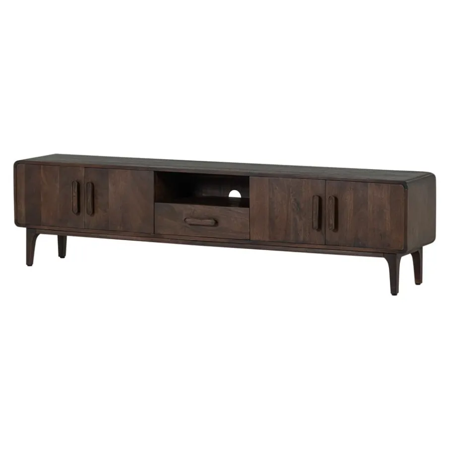 - Geef je woonkamer direct een stijlvolle upgrade met dit prachtige tv-meubel van warm mangohout, afgemaakt met elegante afgeronde hoeken en unieke houten handgrepen.