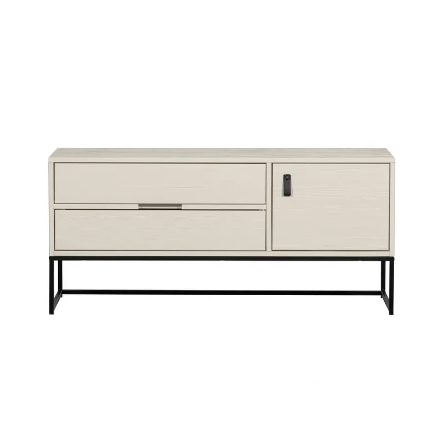 Het tv-meubel heeft twee lades van 70 cm breed en 13 cm hoog. Aan de rechterkant zit nog een vak van 41×50 cm. Hierin zit 1 legplank en wordt afgesloten met een deur. De lades hebben een zwart metalen handgreep en op de deur zit een zwart leren handgreep. Het meubel is aan de achterzijde voorzien van een gat, voor het wegwerken van kabels.