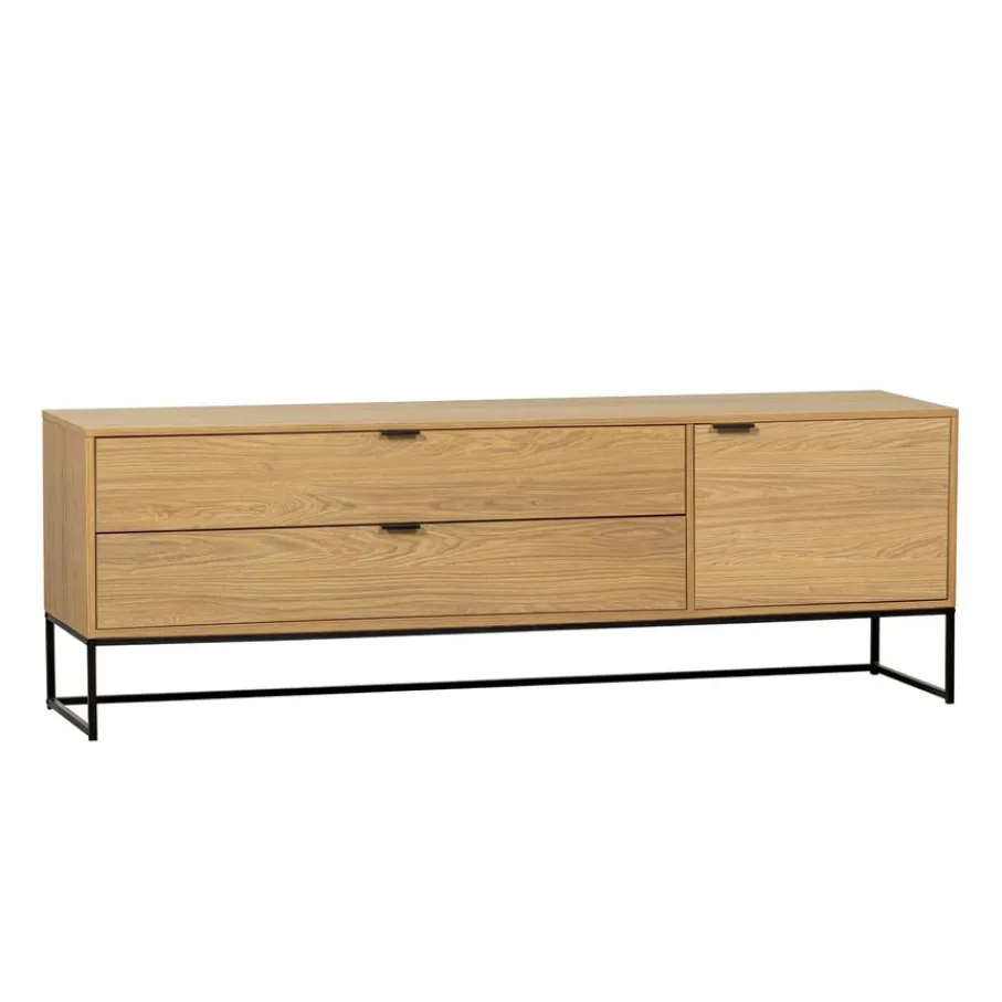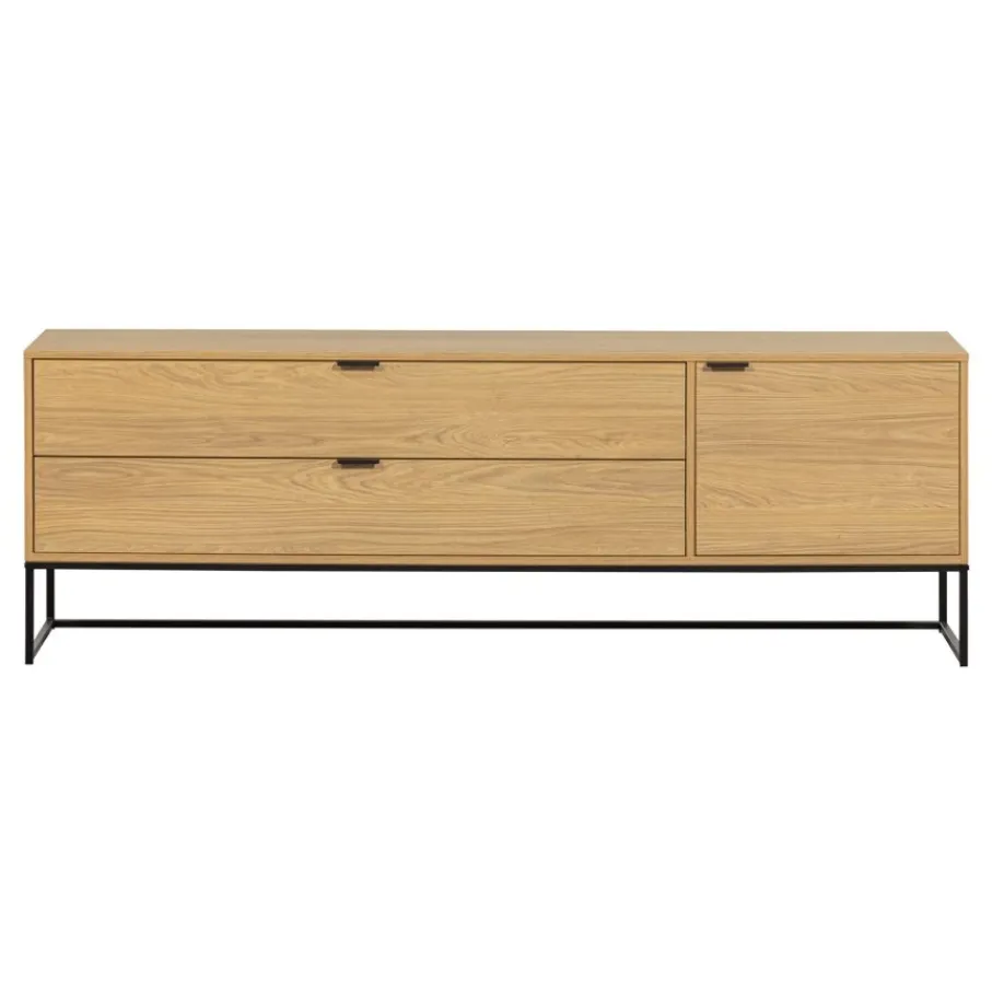 Het tv-meubel heeft twee ruime laden van maar liefst 121 cm breed en 13 cm hoog. Aan de rechterkant zit nog een vak van 41×50 cm. Hierin zit 1 legplank en wordt afgesloten met een deur. De deur en lades hebben een zwart metalen handgreep. Het meubel is aan de achterzijde voorzien van een gat, voor het wegwerken van kabels.