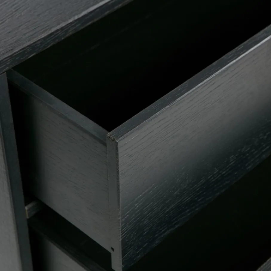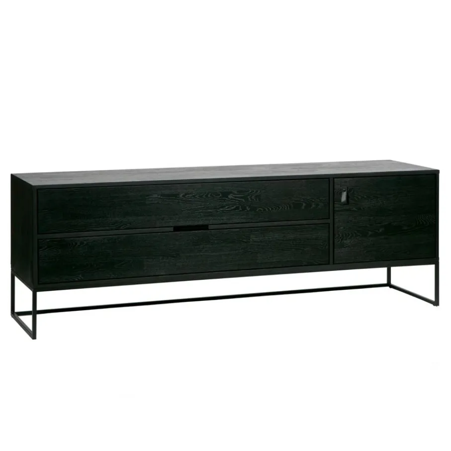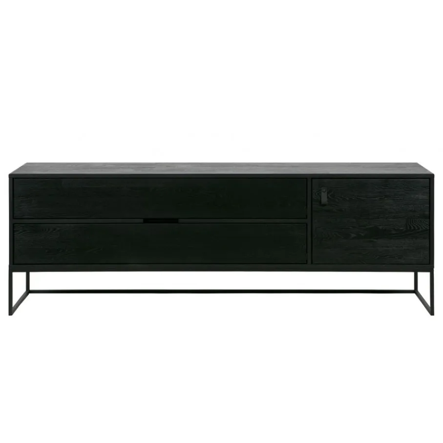 Dit elegante tv-meubel Silas heeft een robuuste en toch stijlvolle look. Deze Silas kast komt uit de Exclusive collectie van woonmerk WOOOD. Het heeft een body van geborsteld massief essen (FSC-gecertificeerd) dat is afgelakt in de kleur blacknight. Het onderstel is een open en hoog frame gemaakt van zwart metaal. Het frame geeft een luchtige look en is bovendien praktisch met schoonmaken.