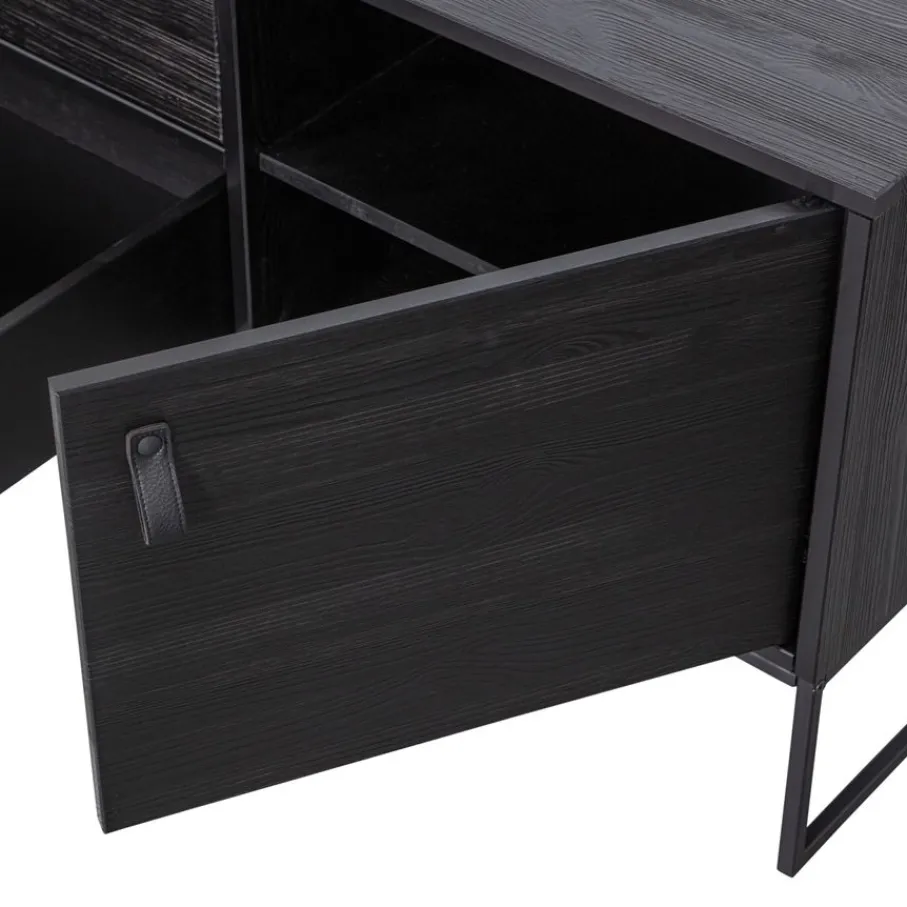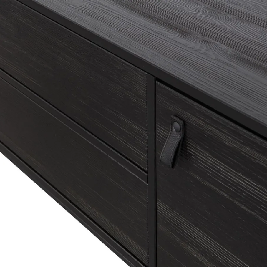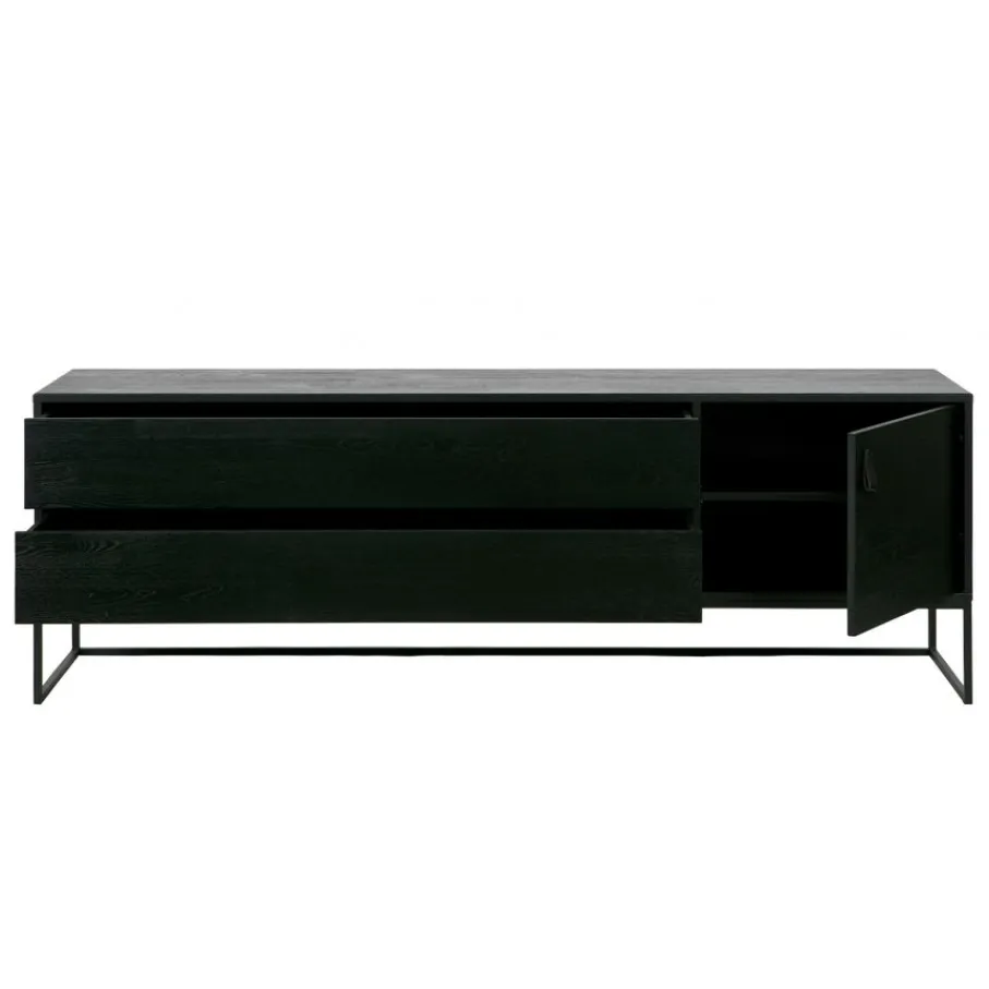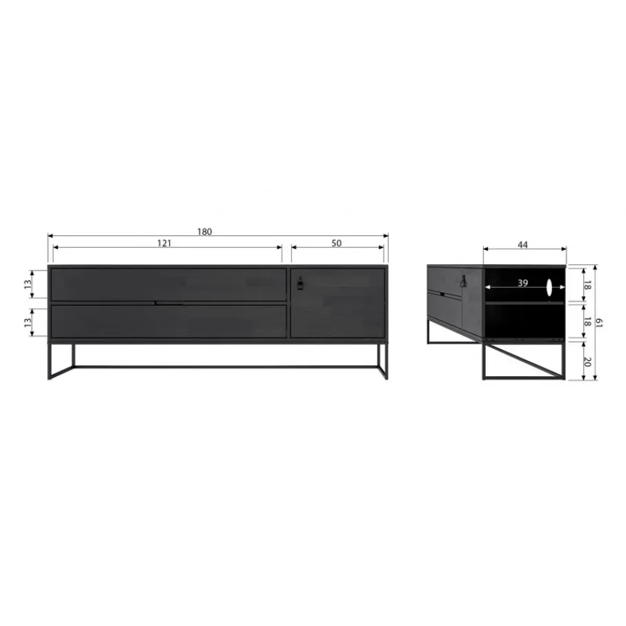 Het tv-meubel heeft twee ruime laden van maar liefst 121 cm breed en 13 cm hoog. Aan de rechterkant zit nog een vak van 41×50 cm. Hierin zit 1 legplank en wordt afgesloten met een deur met een leren handgreep.