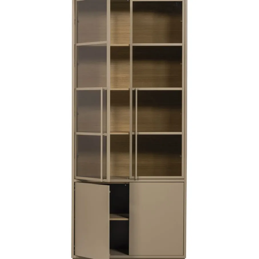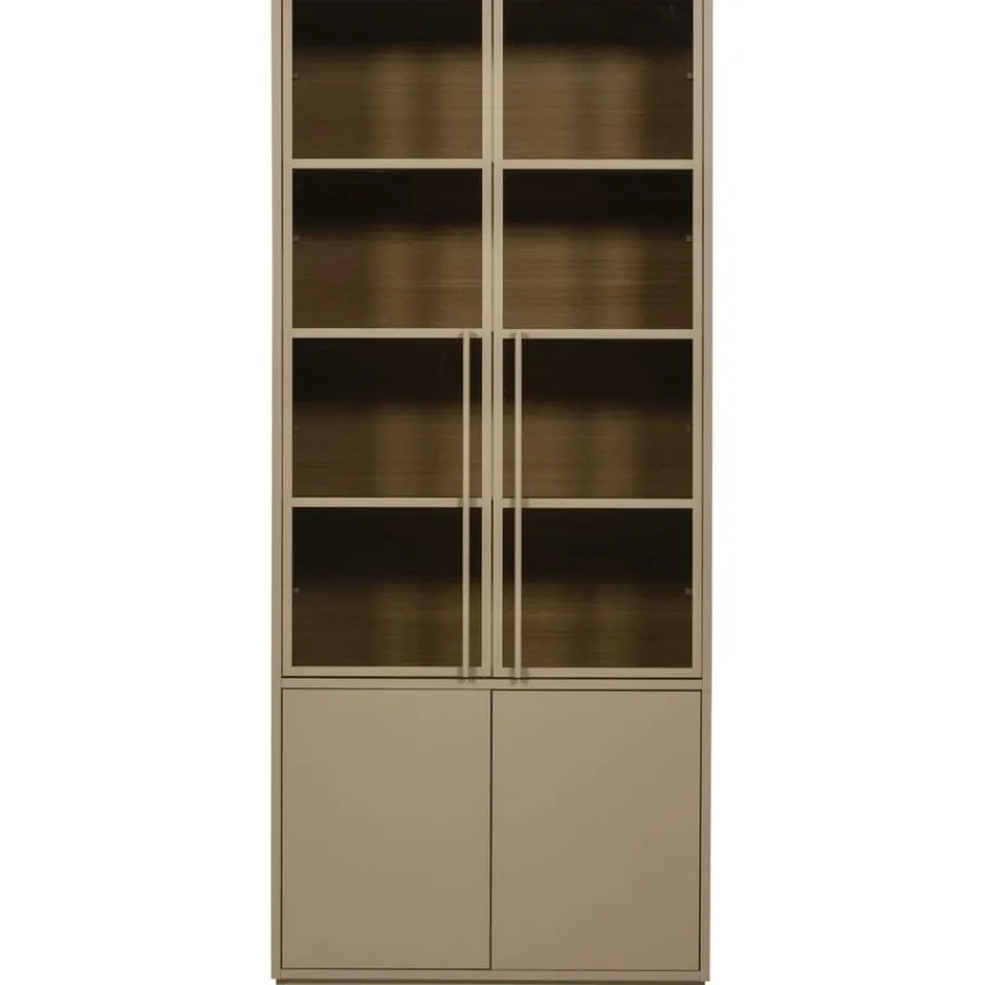 Het vitrine gedeelte biedt vier ruime vakken waarin je jouw accessoires op een stijlvolle manier kunt tentoonstellen. Achter de glazen deuren is de binnen- en achterkant uitgevoerd in een eiken decor. Het onderste gedeelte van de kast creëert juist plek voor spullen die je liever uit het zicht houdt.