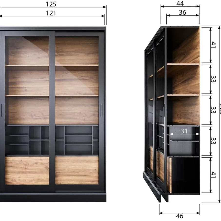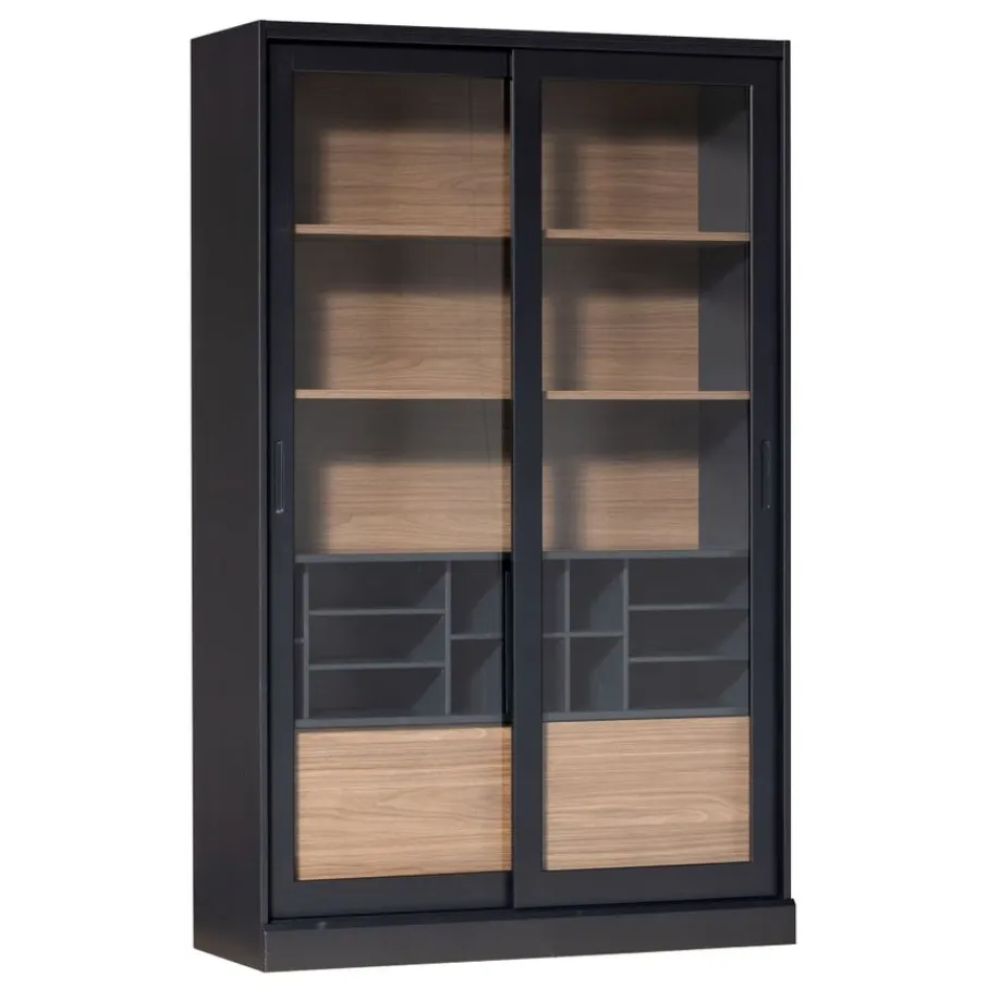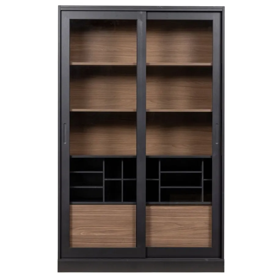 - Verrijk je woonkamer met de trendy look van vitrinekast James. De combinatie van strak zwart met de warme walnootkleur zorgt direct voor een gezellige en moderne sfeer in huis.