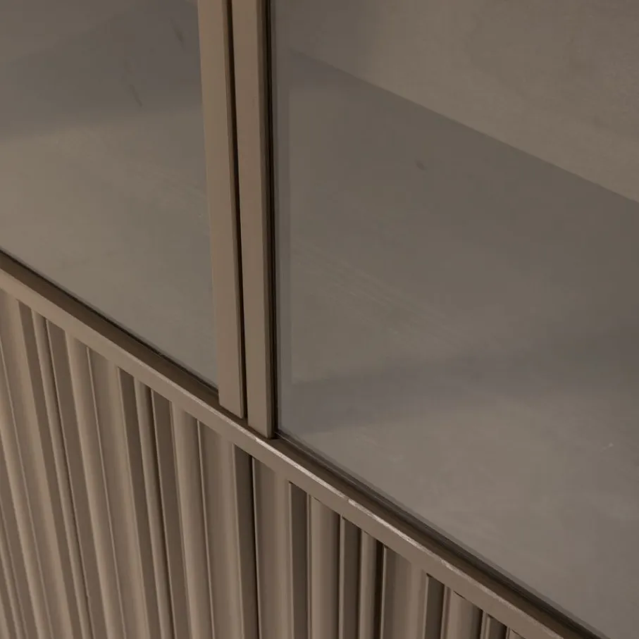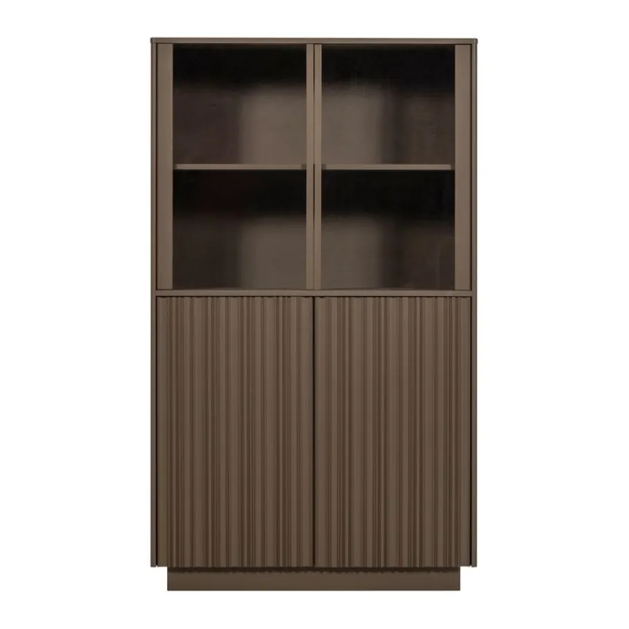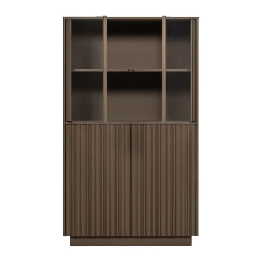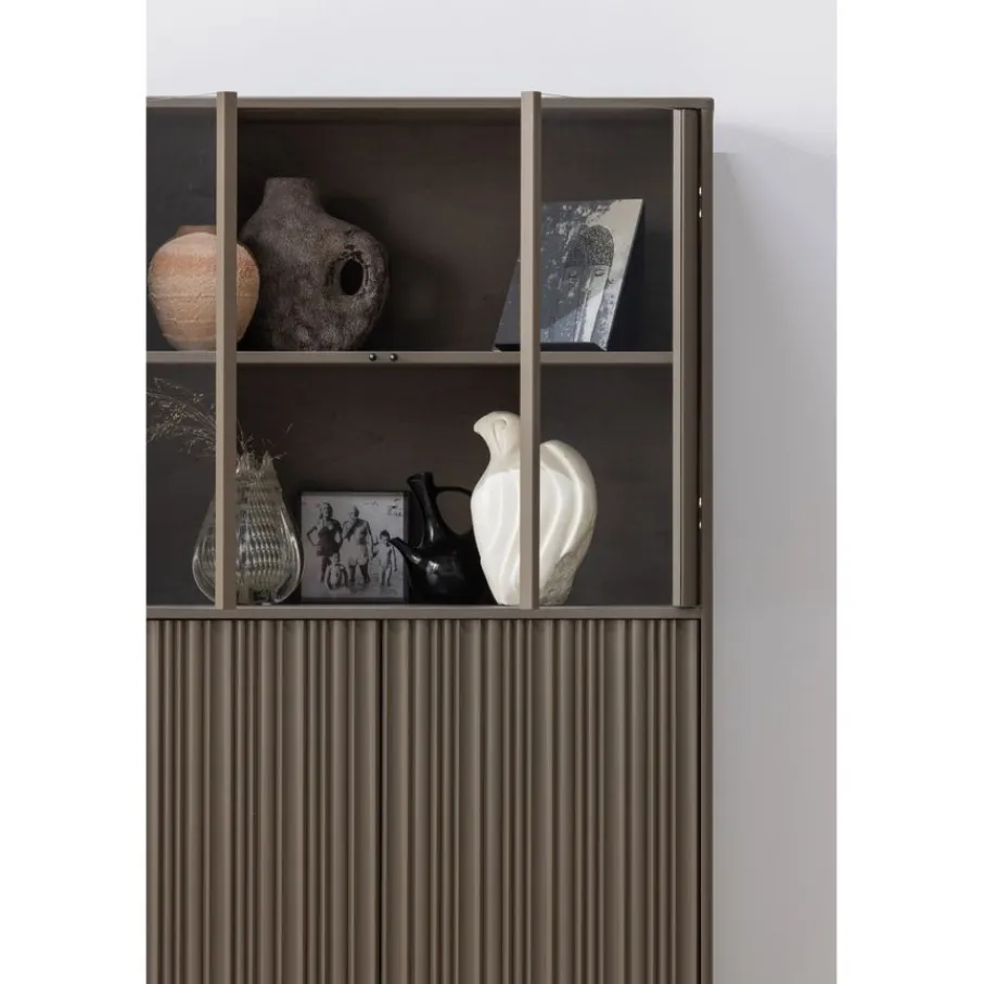 De gesloten onderzijde met grafisch vormgegeven deuren biedt plek waar je moeiteloos spullen uit het zicht opbergt. De bovenste helft biedt juist plek voor je mooiste pronkstukken, stijlvol en veilig achter glas. De deuren zijn greeploos, en te openen middels het push-to-open systeem.