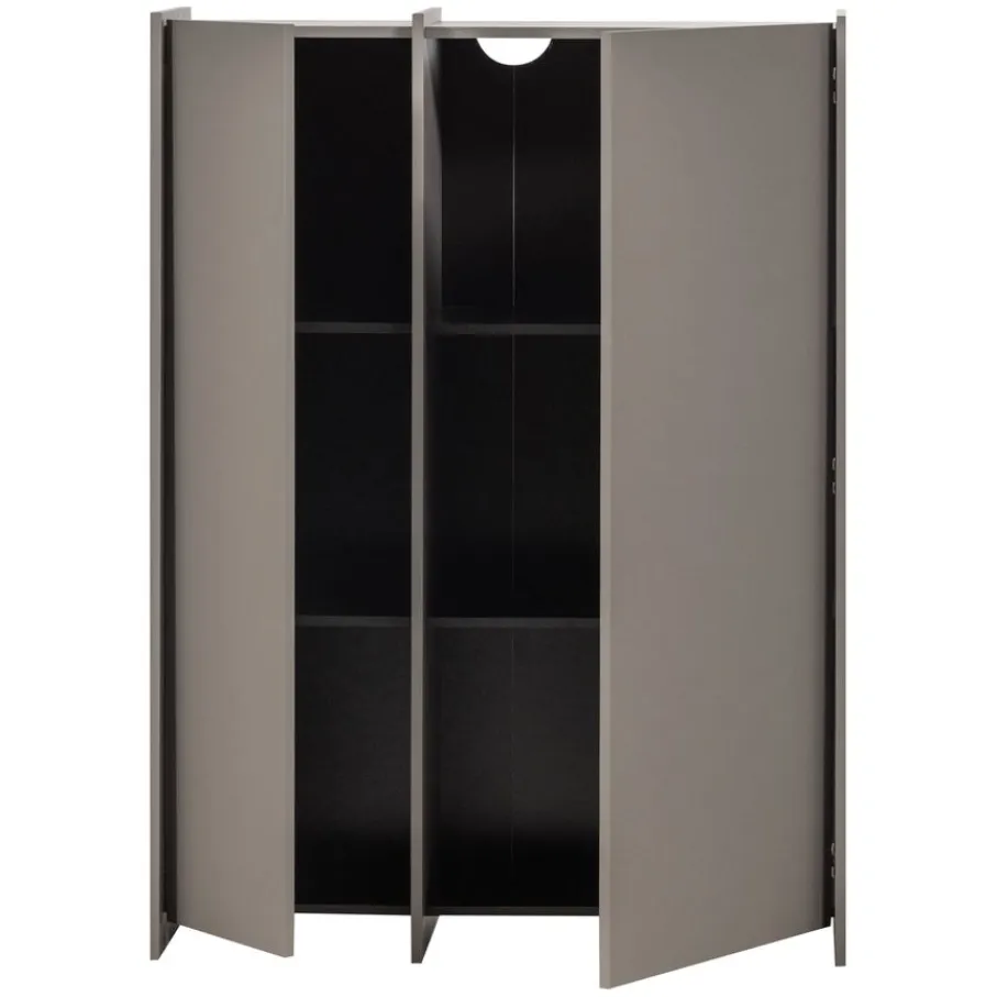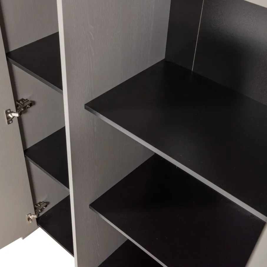 Achter de twee greeploze deuren bevindt zich een zee aan opbergruimte, verdeeld over twee compartimenten. De kast is voorzien van vier legplanken, waardoor je zes ruime vakken hebt om je spullen georganiseerd op te bergen. Het totale draaggewicht van de kast is 45 kg.