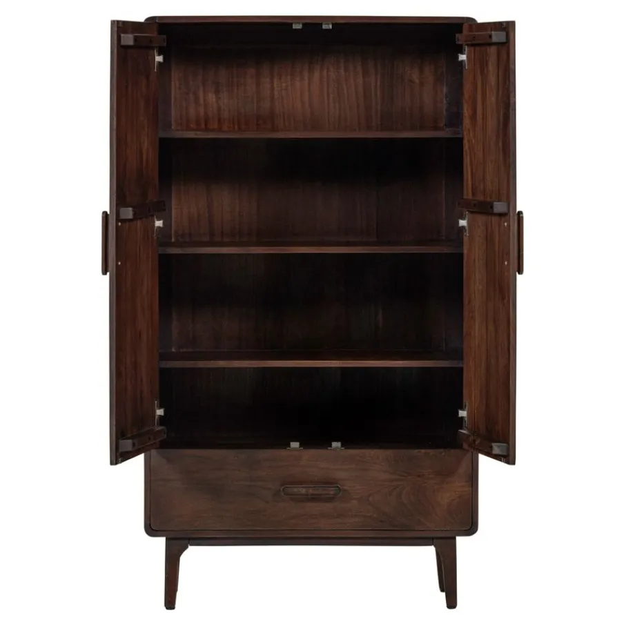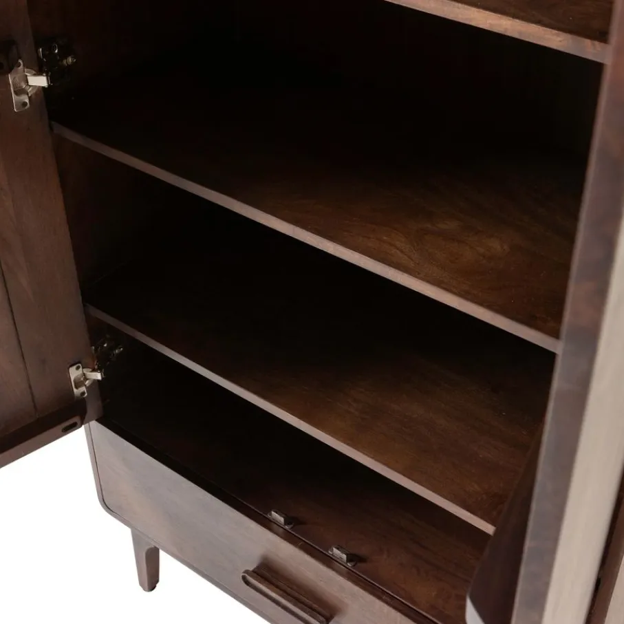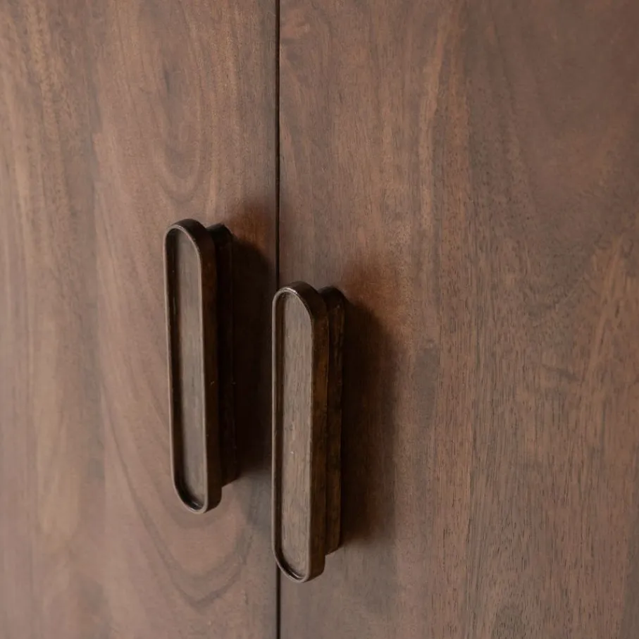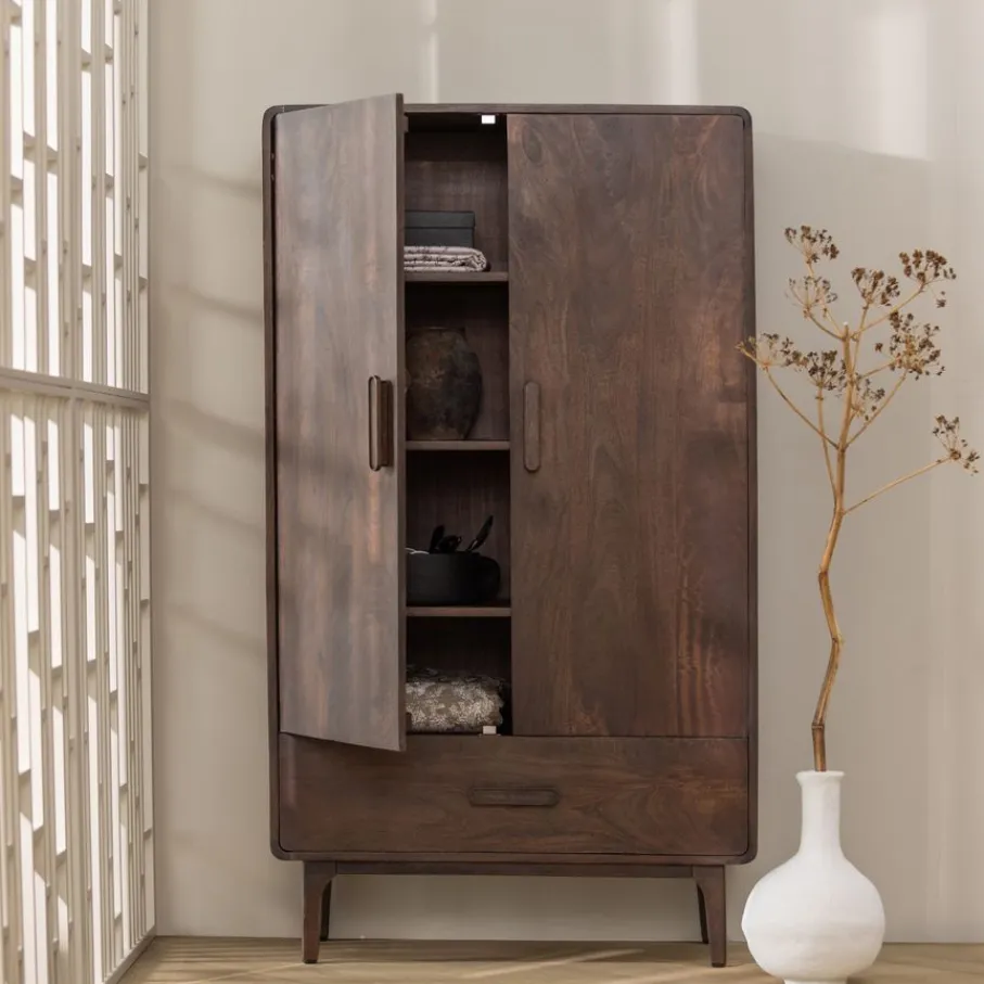 Wandkast Liya van WOOOD brengt met zijn design look een elegante sfeer in elk interieur. De afgeronde hoeken geven het opbergmeubel een vriendelijke uitstraling, waardoor het een toegankelijke toevoeging is voor diverse interieurstijlen. Het donkerbruine mangohout heeft een zichtbare nerfstructuur die elk exemplaar uniek maakt en karakter toevoegt aan de woon-, slaap- of werkkamer. Met deze eigenschappen zorgt wandkast Liya voor stijl en sfeer in elke ruimte.