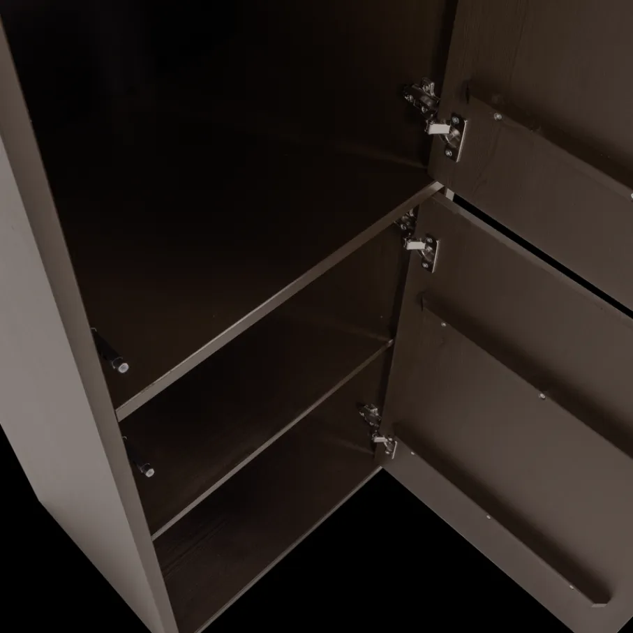 Wandkast Meggy biedt vijf vakken achter twee deuren. Zo is er ruime opbergmogelijkheid. De deuren zijn greeploos en voorzien van een modern push-to-open systeem.