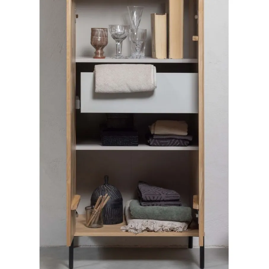 - Voeg een luchtige en elegante touch toe met de strakke zwarte metalen poten en de verfijnde naturel eiken afwerking, die de kast een moderne en tijdloze uitstraling geven.