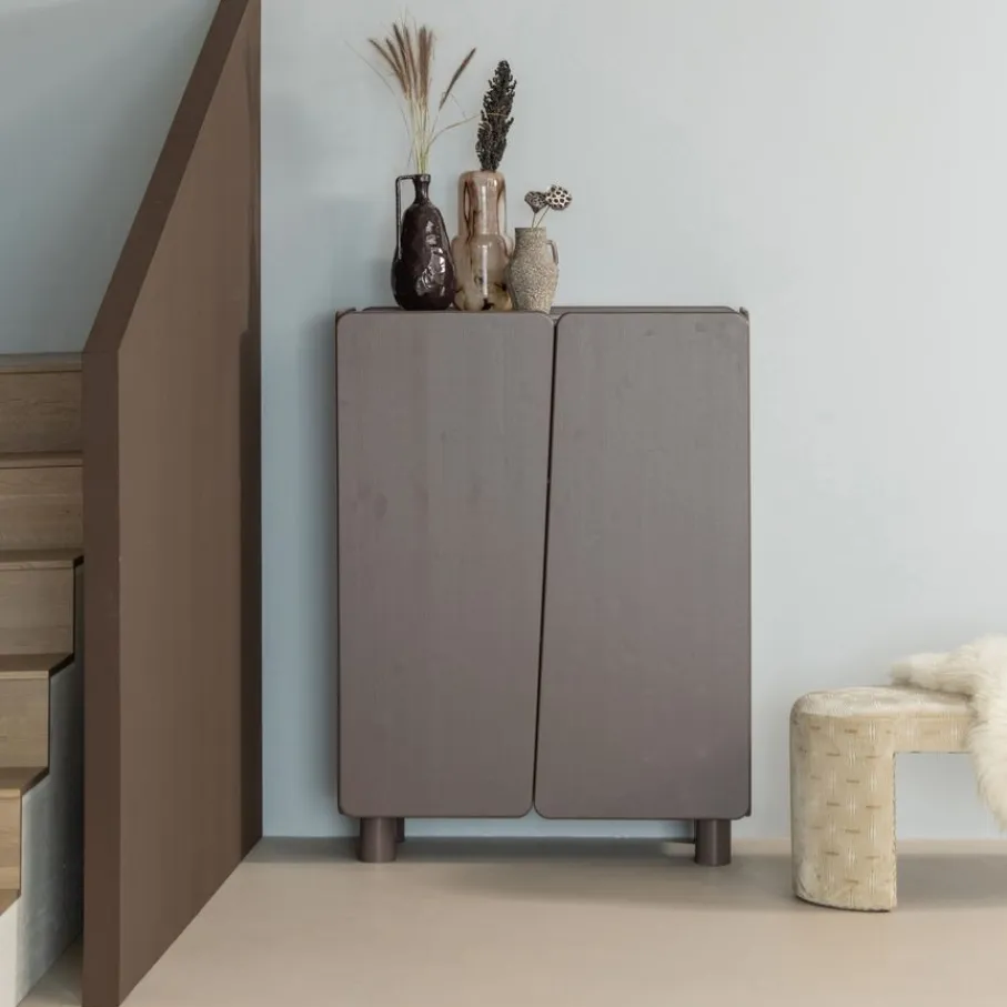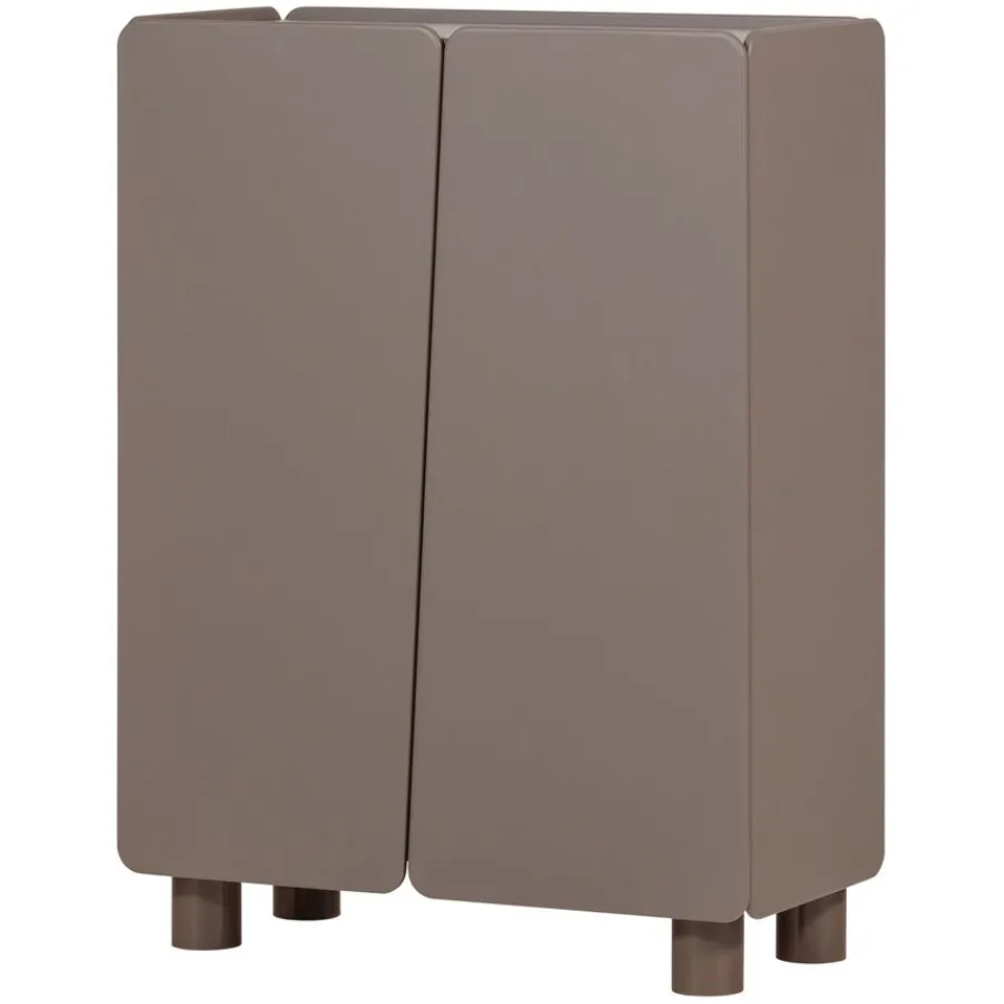 Wandkast Root van WOOOD is een opbergkast met een opvallend en speels karakter. Dit item kenmerkt zich door de afgeronde hoeken en de diagonale lijn die de twee deuren van elkaar scheidt. De kast is uitgevoerd in een truffel bruine tint en staat op robuuste, cilindervormige poten. Dankzij het ontwerp en de speelse hoogte van 135 cm is wandkast Root een sfeervolle toevoeging in de woonkamer, hal of slaapkamer.