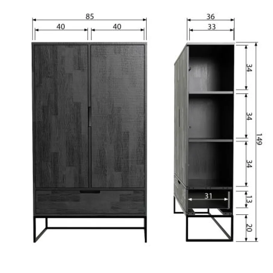 De wandkast heeft 2 grote deuren, daarachter vind je 2 planken. Elke plank heeft een draaggewicht van 15 kg. De grote lade onderin is 31 cm diep en 13 cm hoog. De deuren en lade van de kast hebben zwart metalen handgrepen.
