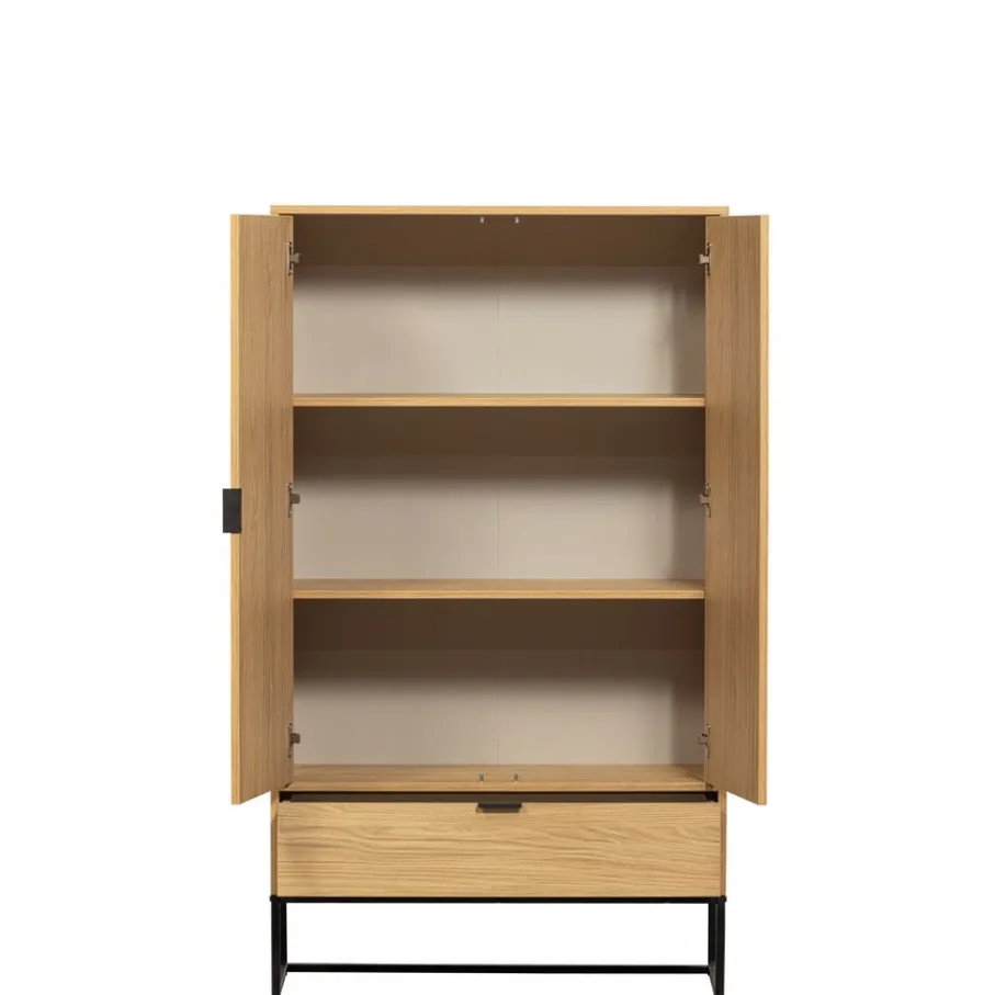 De wandkast heeft 2 grote deuren, daarachter vind je 2 planken. Elke plank heeft een draaggewicht van 15 kg. De grote lade onderin is 31 cm diep en 13 cm hoog. De deuren en lade van de kast hebben zwart metalen handgrepen.