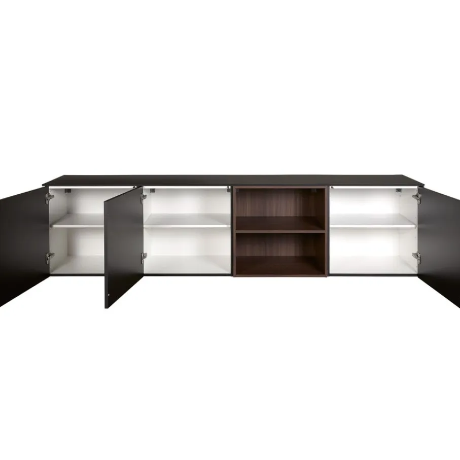 - Geef je interieur een stijlvolle boost met het strakke grafietzwarte design, sfeervol gecombineerd met warme noten houtlook open vakken.