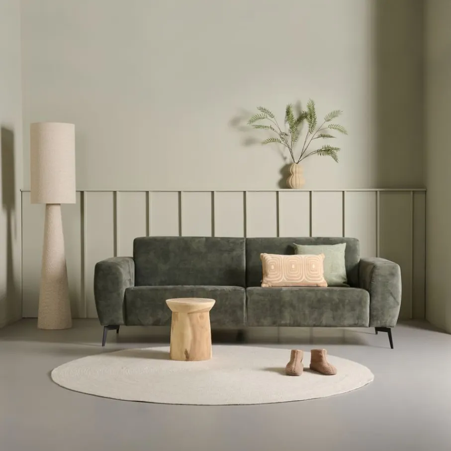 De 3-zitsbank Ameland is bekleed met stof Adore, een velours stof van 100% polyester. De zachte stof heeft een mooie vleug en subtiele glans. De kleur is Hunter, een vergrijsd groene tint.