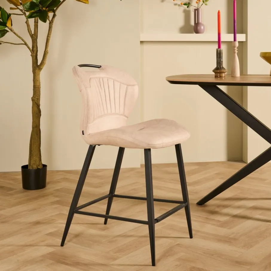 Barkruk Lenno is bekleed met stof Luxor in kleur Sand. De zachte microvezel bekleding heeft een fijne structuur en doet denken aan vintage leder. De beige kleur is een lichte, neutrale kleur die prachtig staat in veel interieurs. Het geeft de kruk een warme en uitnodigende uitstraling. De ranke poten van zwart metaal zorgen voor een mooi contrast en maken het ontwerp helemaal af, waardoor barkruk Lenno zowel robuust als elegant oogt.