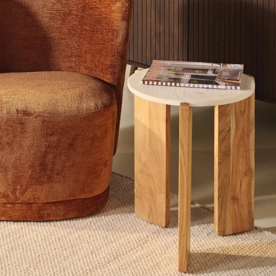 - Warmte en elegantie in één: Het prachtige marmeren blad in combinatie met de warme acaciahouten poten zorgt voor een luxueuze uitstraling die jouw interieur direct omtovert.