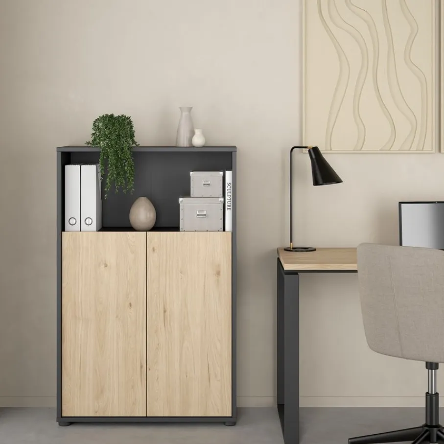 - Geef je interieur een moderne boost met de stijlvolle combinatie van donkergrijs en de warme eiken houtlook, perfect voor een eigentijdse sfeer.