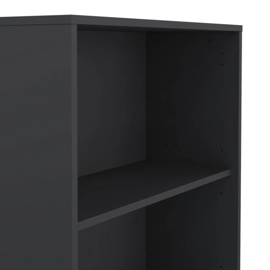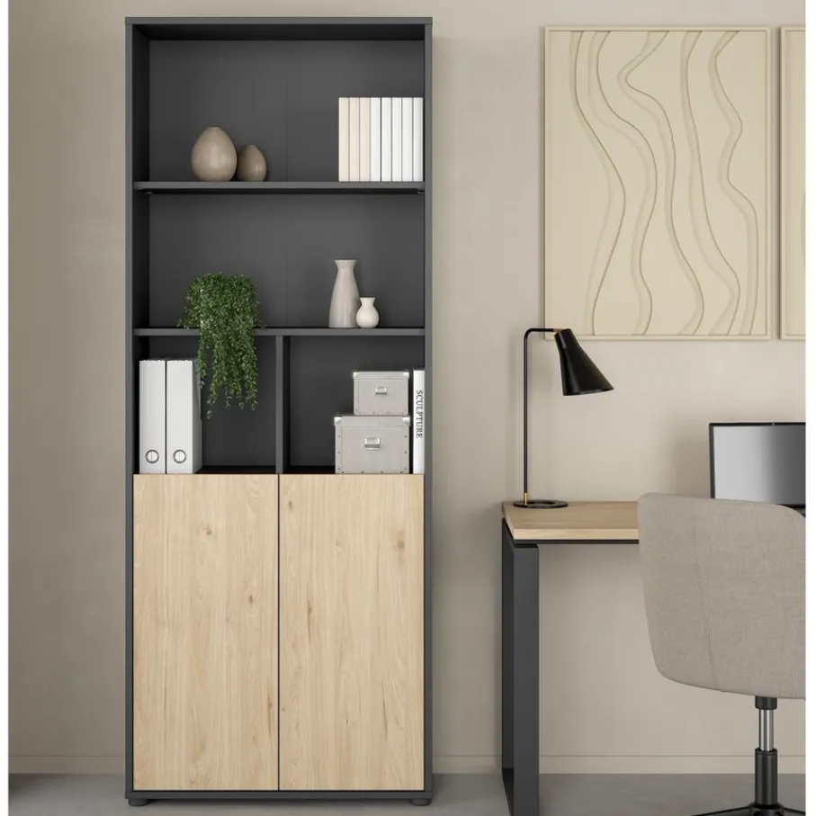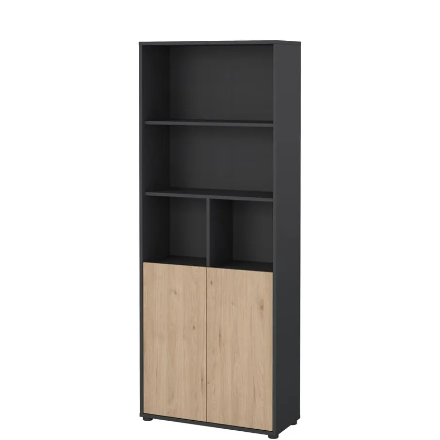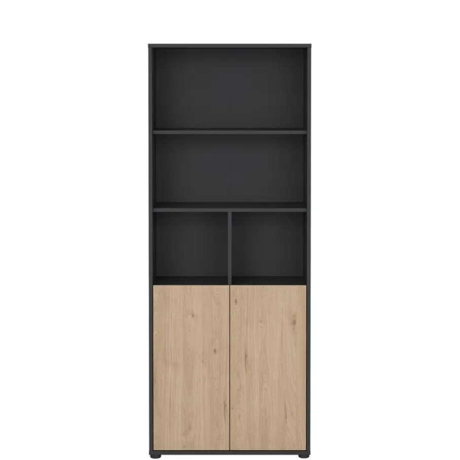 Boekenkast Bram heeft bovenin vier open vakken, ideaal voor boeken die je graag in het zicht hebt of decoratieve objecten. Daaronder zorgen de twee deurtjes voor een opgeruimde uitstraling, ideaal om spullen uit het zicht te bewaren. De deuren zijn greeploos, wat een minimalistische look geeft.