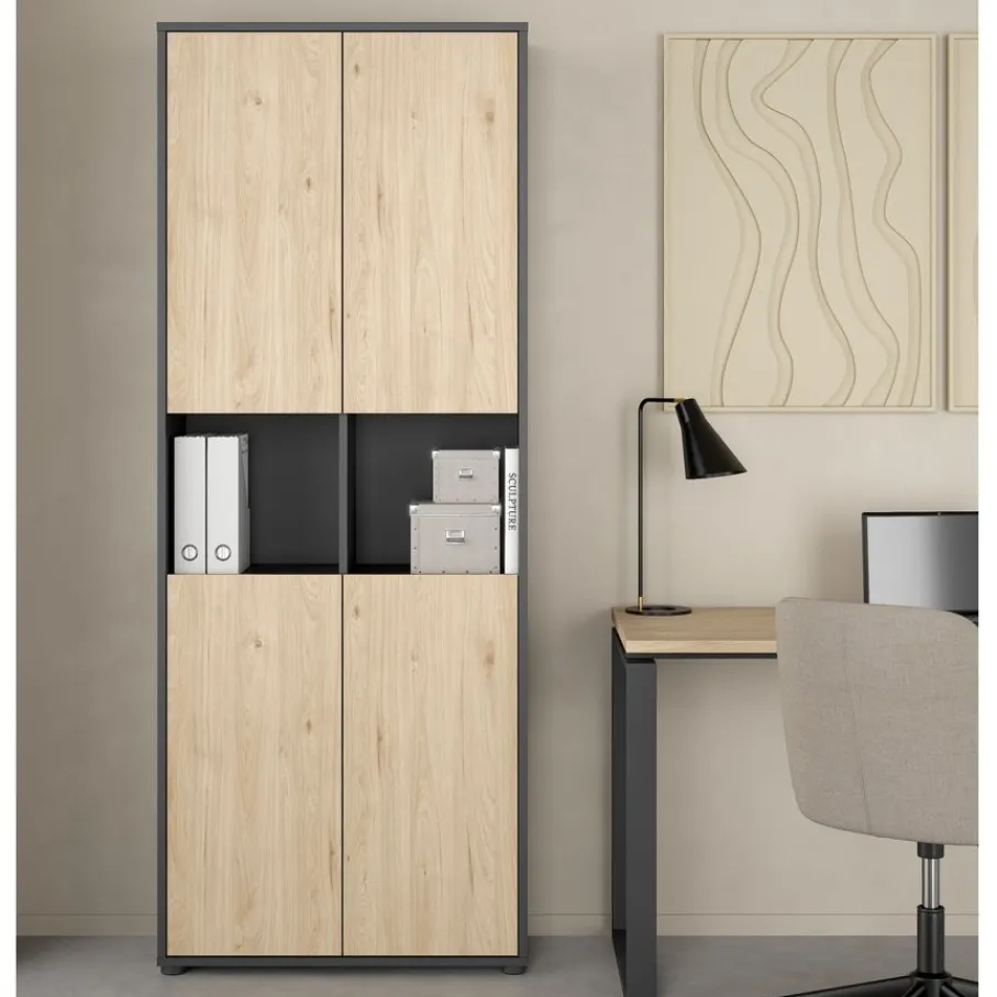 - Donkergrijs met accent in eiken houtlook