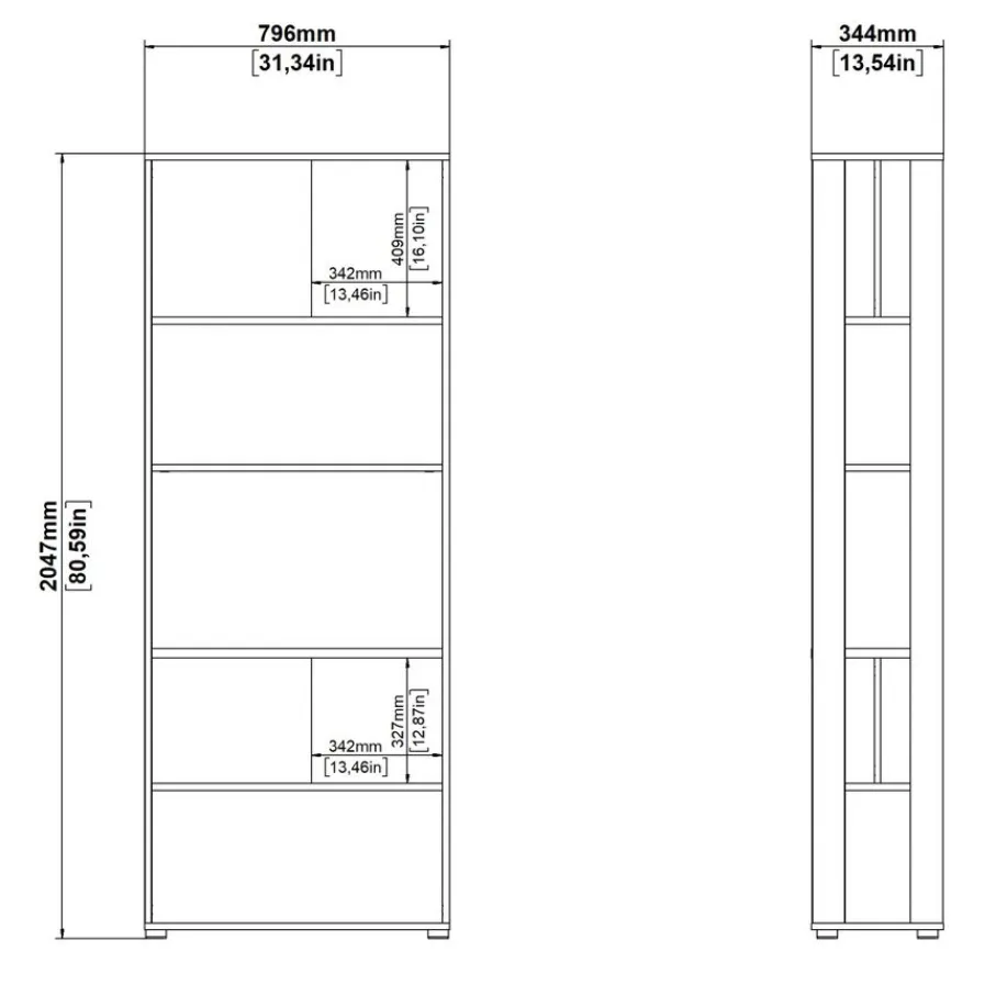 De boekenkast heeft vier vaste planken, waarvan de twee in het midden kleine scheidingswandjes hebben. Deze staan op het midden in de diepte van de kast wat veelzijdige opbergmogelijkheden biedt.