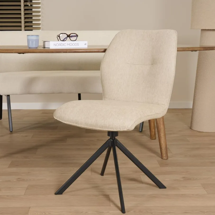 Het binnenwerk is stevig en duurzaam, dankzij de combinatie van beukenhout en houtvezelplaat. Het zitgedeelte heeft een basis van nosagvering met daarop een koudschuim vulling. De zitdiepte is 45 cm en de zithoogte is 50 cm. Om het comfort af te maken is de stoel draaibaar en heeft bovendien Automatic Return. Hierdoor draait eetkamerstoel Bjorna steeds vanzelf terug in de originele stand.