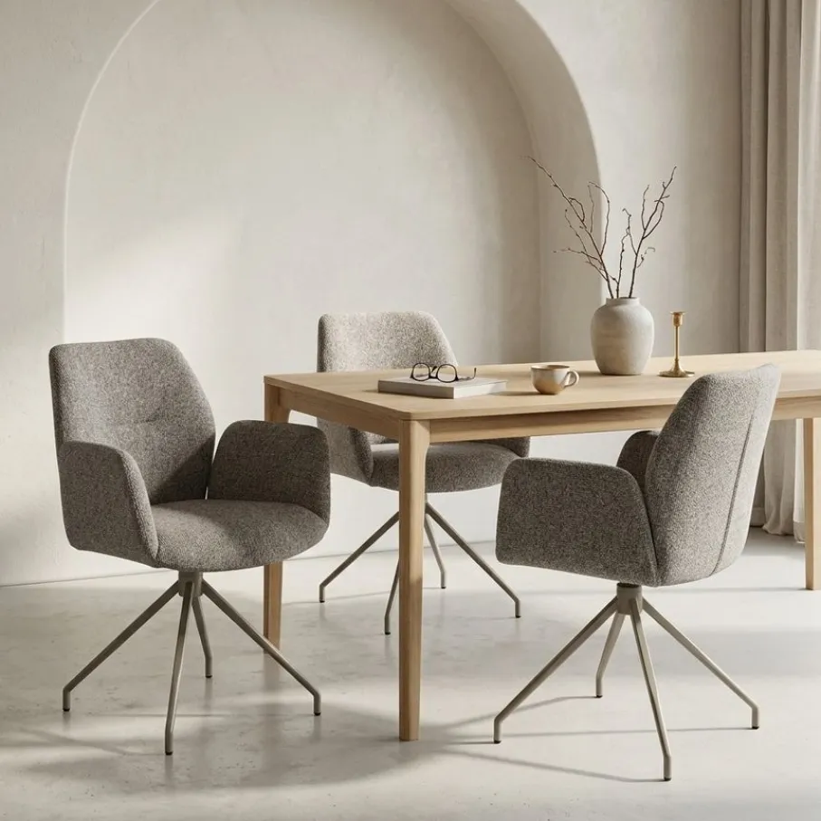 Comfort staat voorop bij eetkamerstoel Borup. De zitting is gevuld met koudschuim, wat zorgt voor een fijne ondersteuning en veerkracht. Zo blijft de stoel mooi in vorm en zit je altijd lekker. De stoel is 360° draaibaar en voorzien van een Automatic Return System, hierdoor draait Borup automatisch terug. De armleuningen maken eetkamerstoel Borup extra comfortabel, perfect voor lange avonden aan tafel.