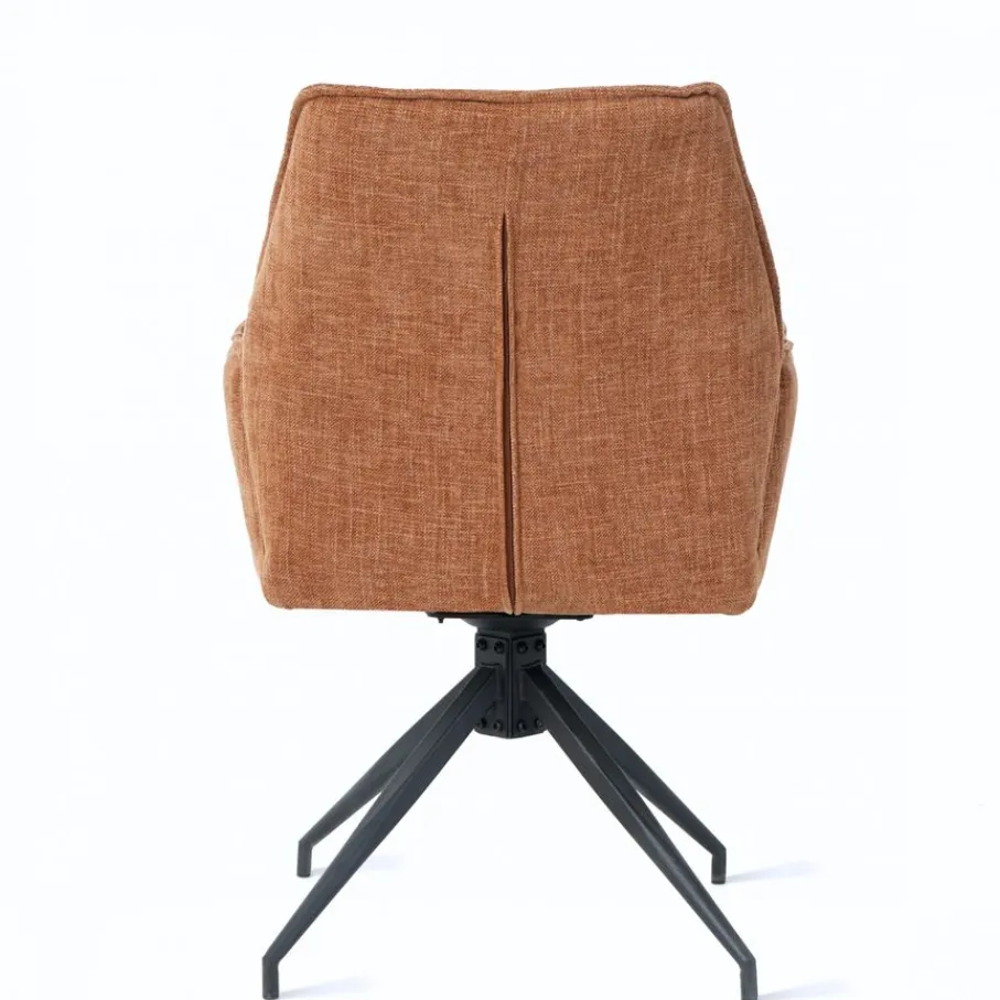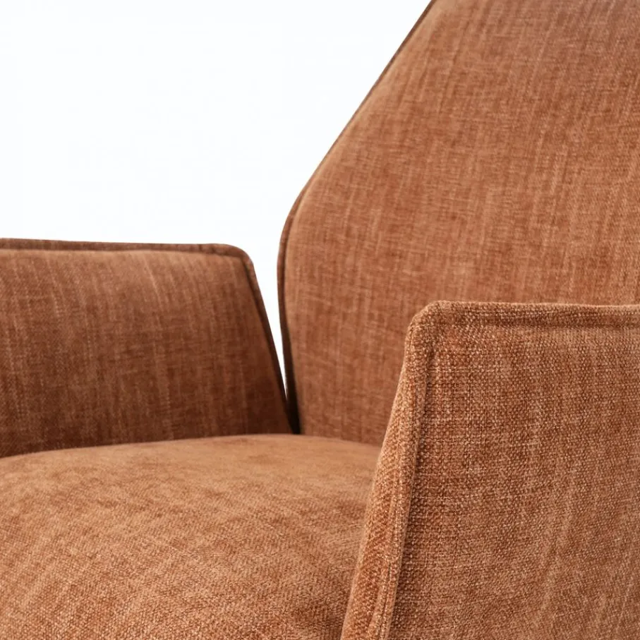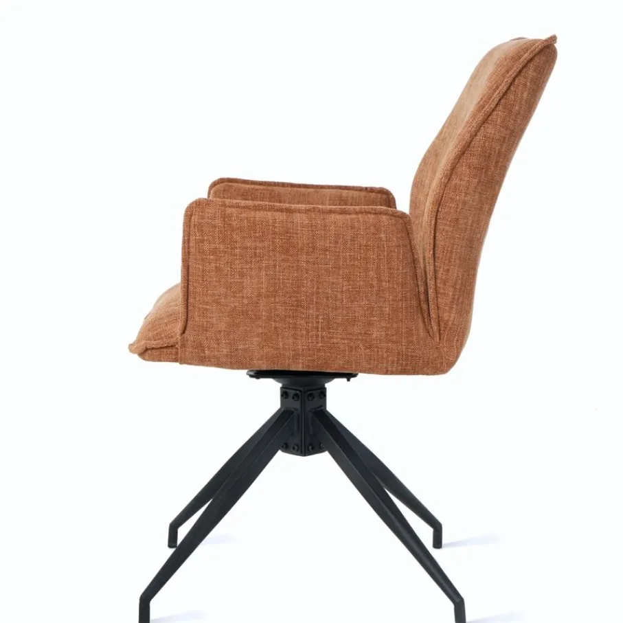 De bekleding is een geweven stof van 20% linnen en 80% polyester in gemêleerde roestbruine kleur. Deze stof met een fijne structuur zorgt voor een sfeervolle en uitnodigende uitstraling.