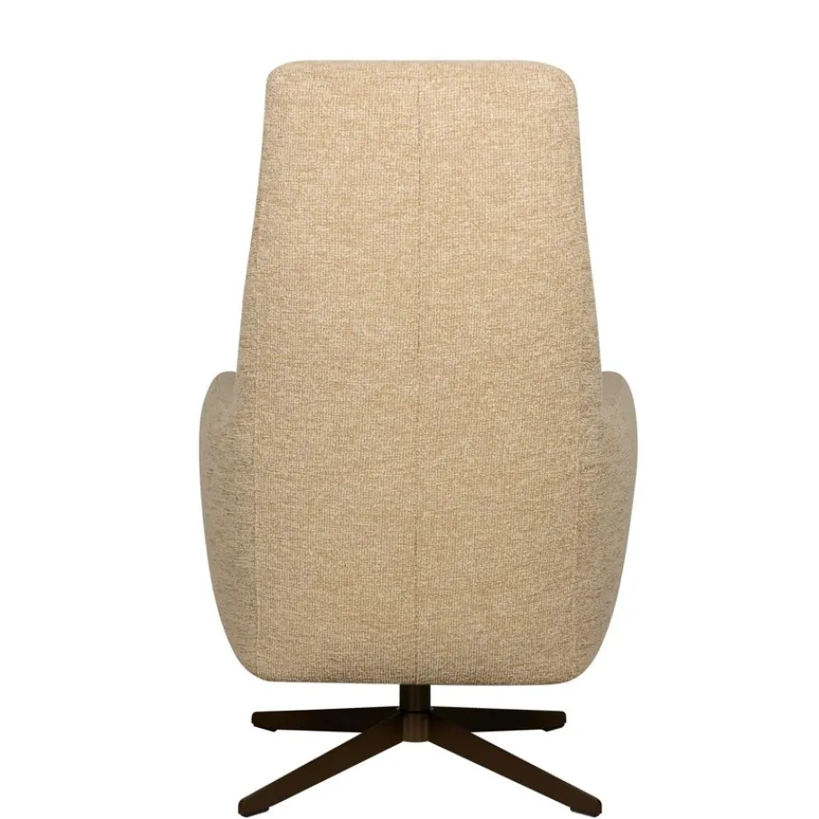 De fauteuil is bekleed met stof Lodge van 100% polyester in kleur Sand. Deze bouclé stof heeft een gemêleerde zandkleur. Deze neutrale en warme tint is makkelijk te combineren.