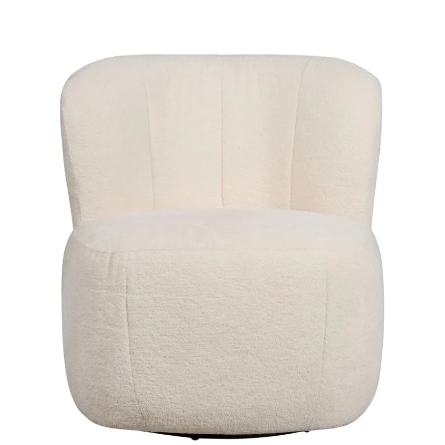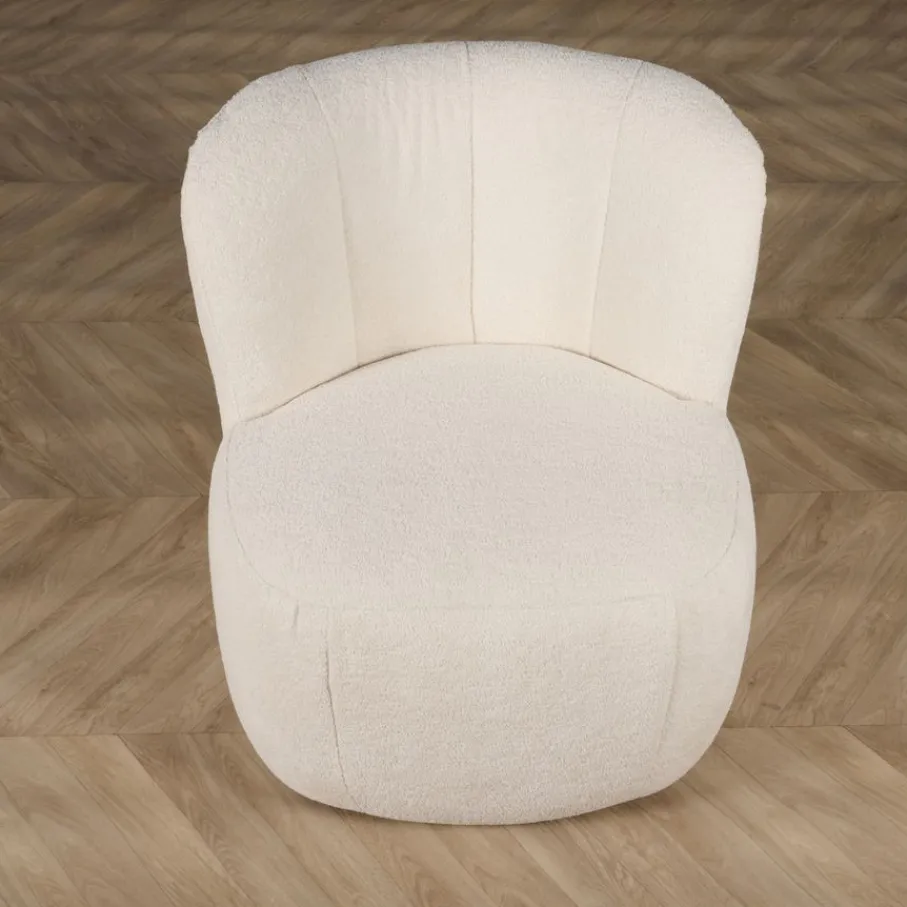 De draaifauteuil heeft een bouclé bekleding met een rijke structuur. De stof is aangenaam zacht en hierdoor uitnodigend. De crème kleur is een romige wittint, een kleur die makkelijk te combineren is.