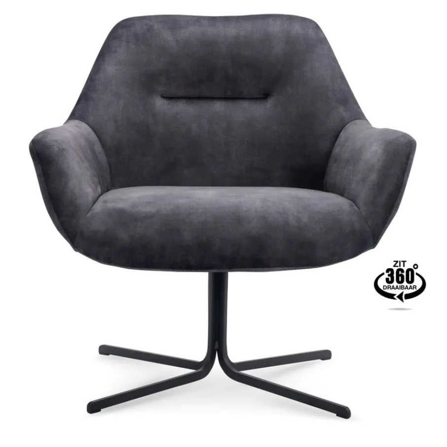 De fauteuil is bekleed met een fluwelen stof van 100% polyester, een stof die niet snel verkleurt of verslijt. Deze stof heeft door de mooie vleug een wat wolkerige en luxe uitstraling. De kleur is antraciet, een stijlvolle donkergrijze kleur.