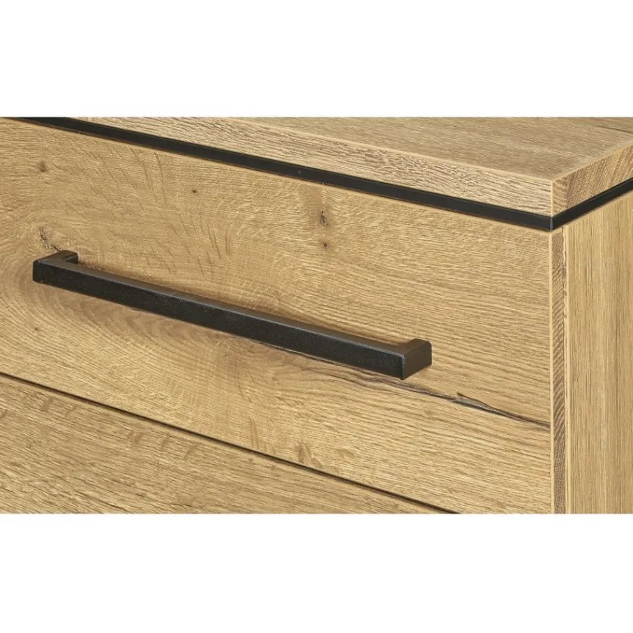 De kast heeft links 2 deuren met daarachter veel opbergruimte. Rechts zitten 3 lades, voorzien van softclose waardoor ze soepel en geruisloos sluiten. Tussen de deuren en lades zitten 3 open vakken, leuk voor wat styling of een paar wijnflessen.