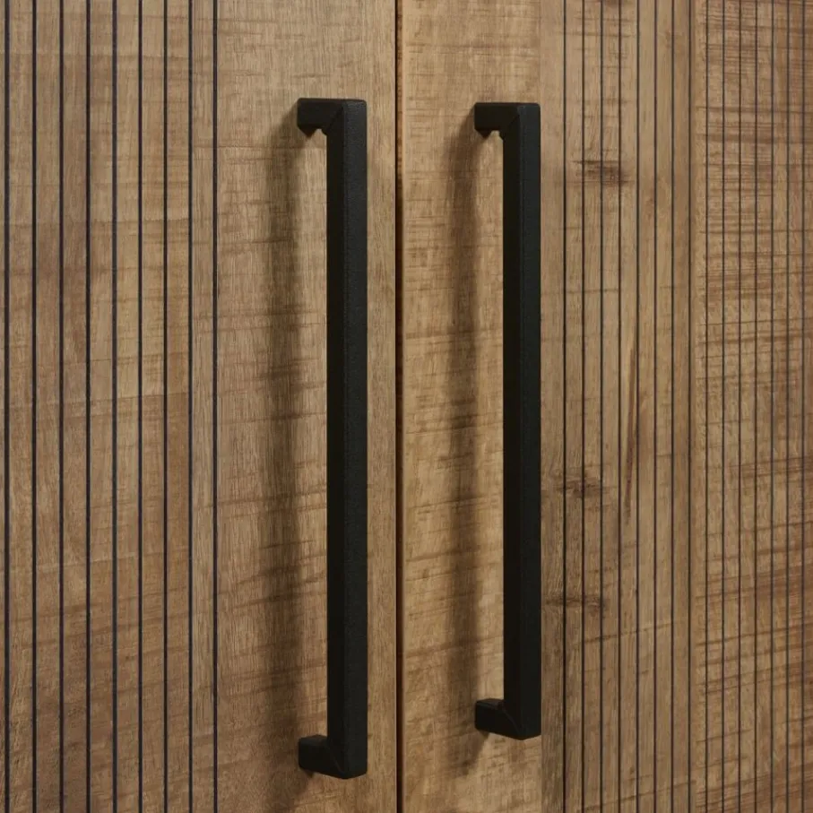Het dressoir heeft in totaal 4 deuren. De kast heeft 2 ruime opbergvakken met voor ieder vak 2 gespiegelde deuren. Elk vak heeft een plank erin, ter verdeling van de ruimte. De deuren zijn voorzien van softclose, hierdoor sluiten ze zacht en soepel. Ze hebben lange zwart metalen handgrepen.