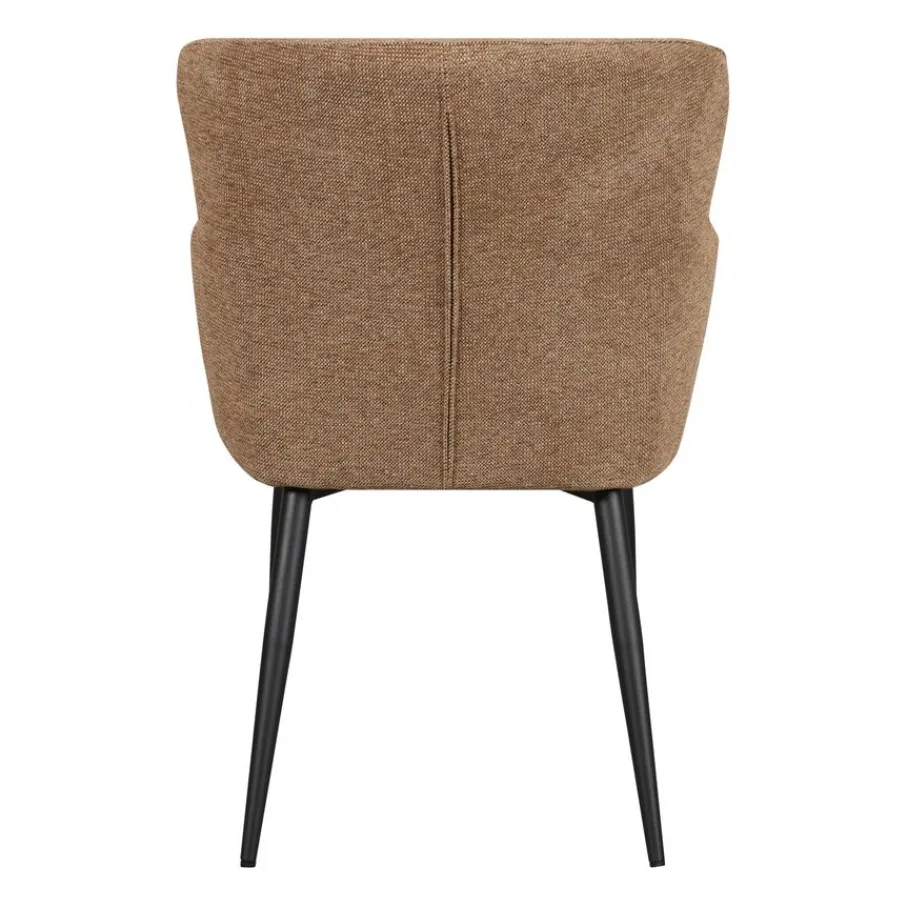 De eetkamerstoel heeft een zachte en neutrale bekleding. De stof is gemaakt van 100% polyester en is sterk en goed kleurvast. Het heeft een mooie structuur en de kleur is een gemêleerde hazelnoot bruin tint. In combinatie met de slanke poten van zwart metaal heeft eetkamerstoel Alba een look die makkelijk combineert.