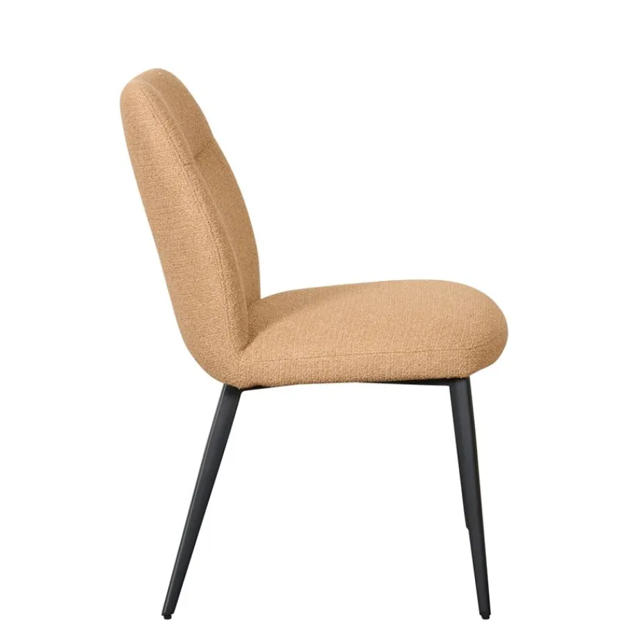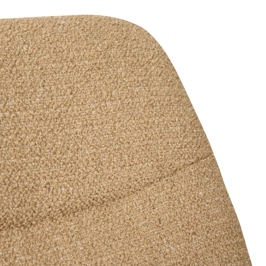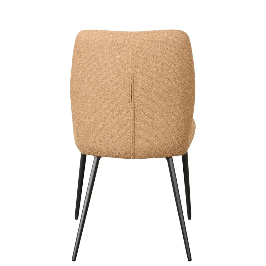 Eetkamerstoel Diest heeft een zachte bekleding in gemêleerde karamel bruine kleur. De stof heeft een rijke bouclé structuur en zorgt voor een warme uitstraling.