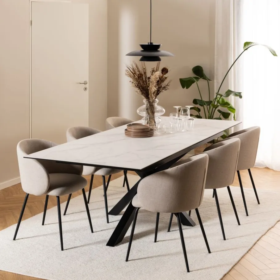 - Sterke en sfeervolle bekleding: De geweven textielstof is niet alleen slijtvast en sterk, maar geeft je eetkamer ook een warme en uitnodigende uitstraling.