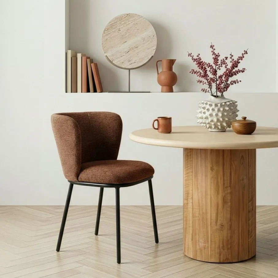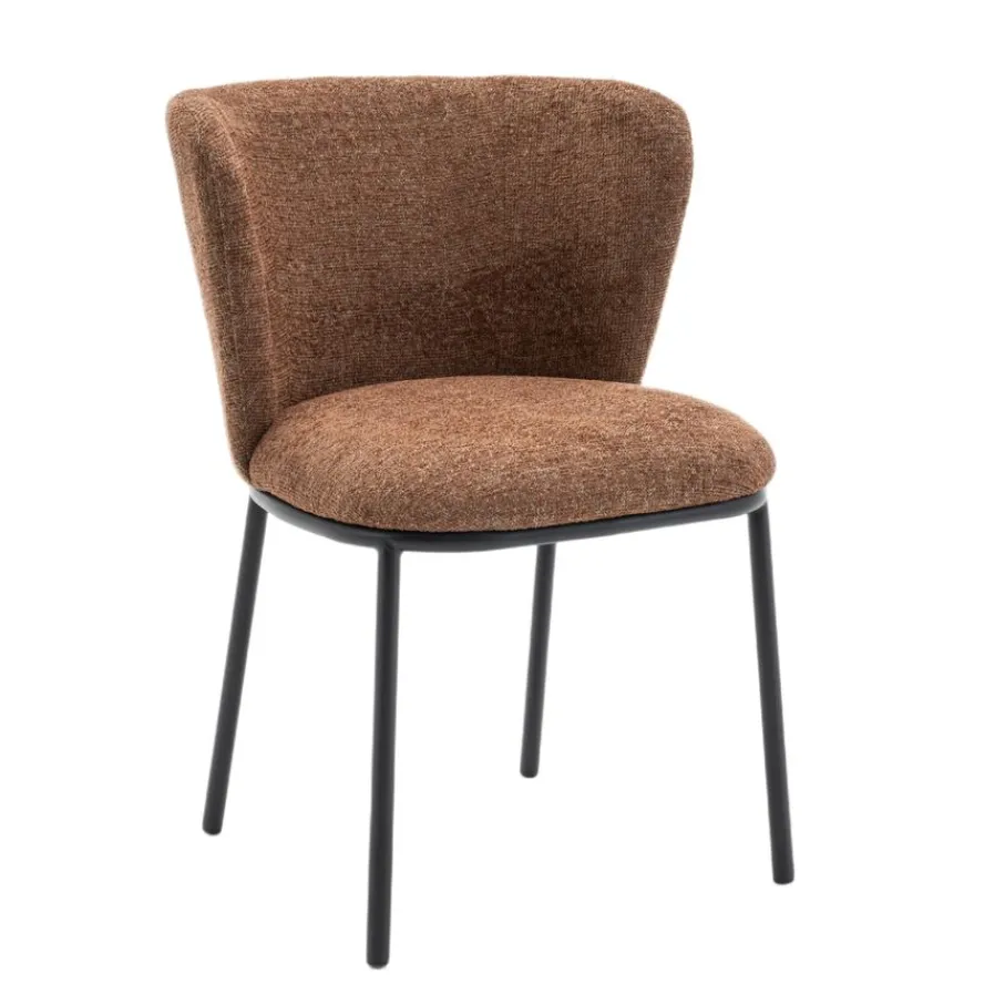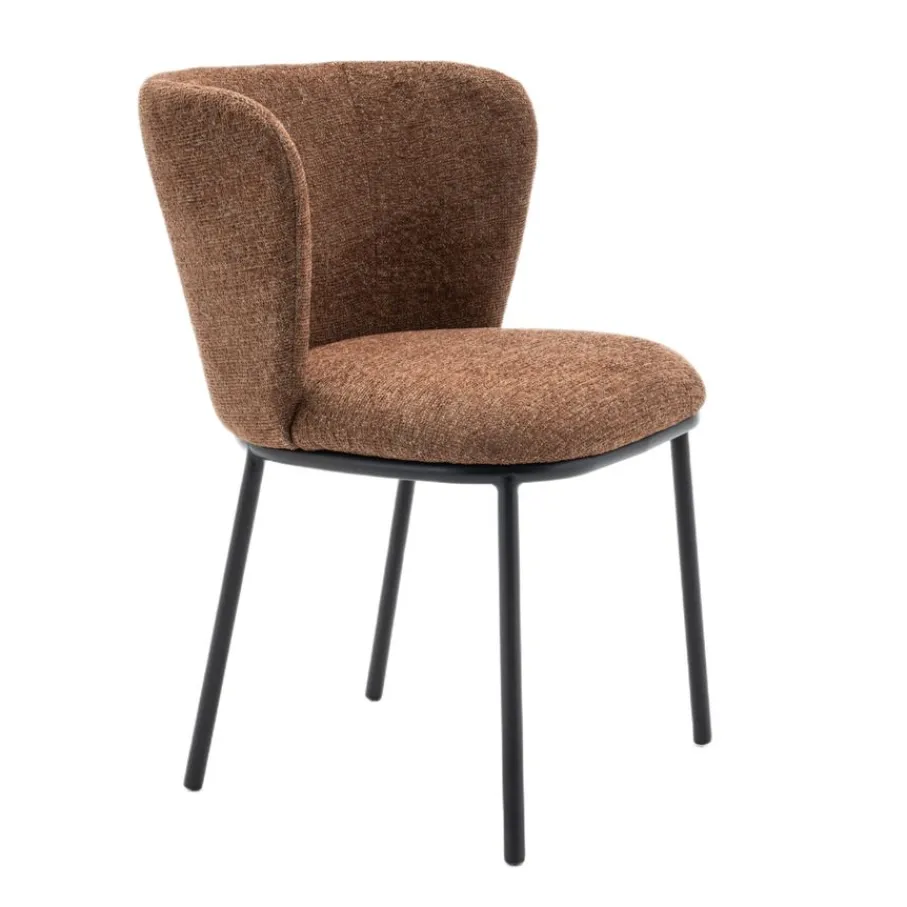 Met eetkamerstoel Maeve haal je een echte blikvanger in huis! De ronde vorm van deze prachtige stoel, gecombineerd met een elegant onderstel van zwart metaal, geeft jouw eethoek direct een frisse en moderne uitstraling. Of je nu uitgebreid gaat tafelen of gezellig bijpraat met vrienden, Maeve nodigt uit om urenlang te genieten. De mosterdbruine kleur van de stof met rijke structuur zorgt voor een warme sfeer en maakt van elke maaltijd een feestje. Eetkamerstoel Maeve is de perfecte mix van stijl en comfort.