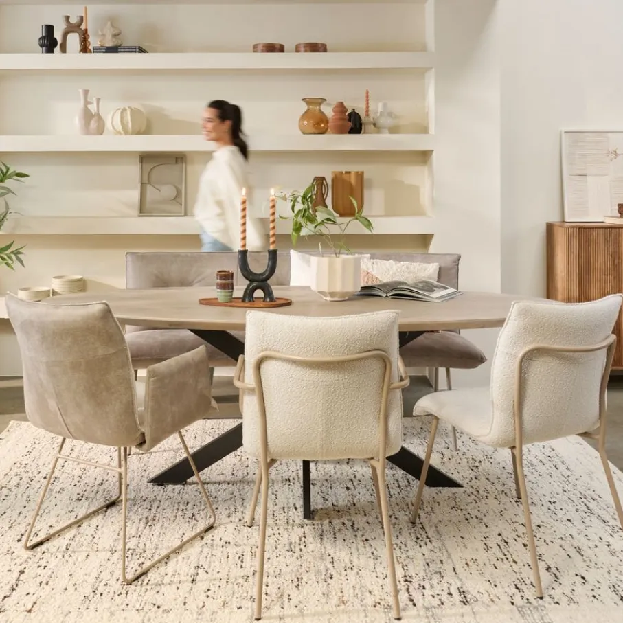 - De ovale vorm vraagt om ruimte: Deze royale ovale tafel komt het mooist tot zijn recht in een eethoek waar de vorm volledig kan ‘ademen’ en de ruimte visueel vergroot.
