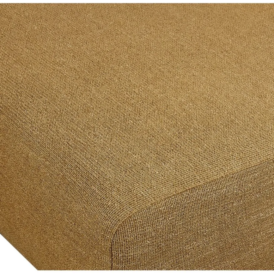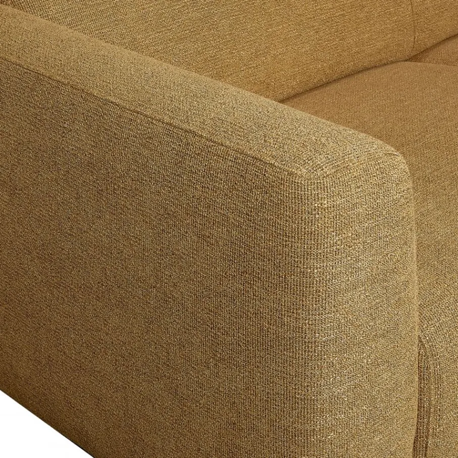 Hoekbank Ameland is bekleed met stof Leaf, een zachte stof van 100% polyester. De stof heeft een wat blokjes achtige structuur. De kleur is Mustard, een gemêleerde okergele tint. Deze kleur staat prachtig in combinatie met warme houtkleuren en met contrasterend zwart wordt het weer een stoer geheel.