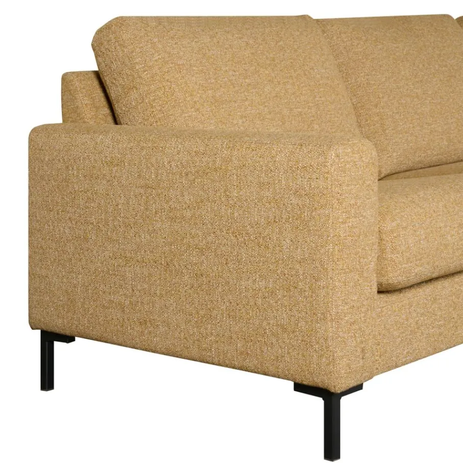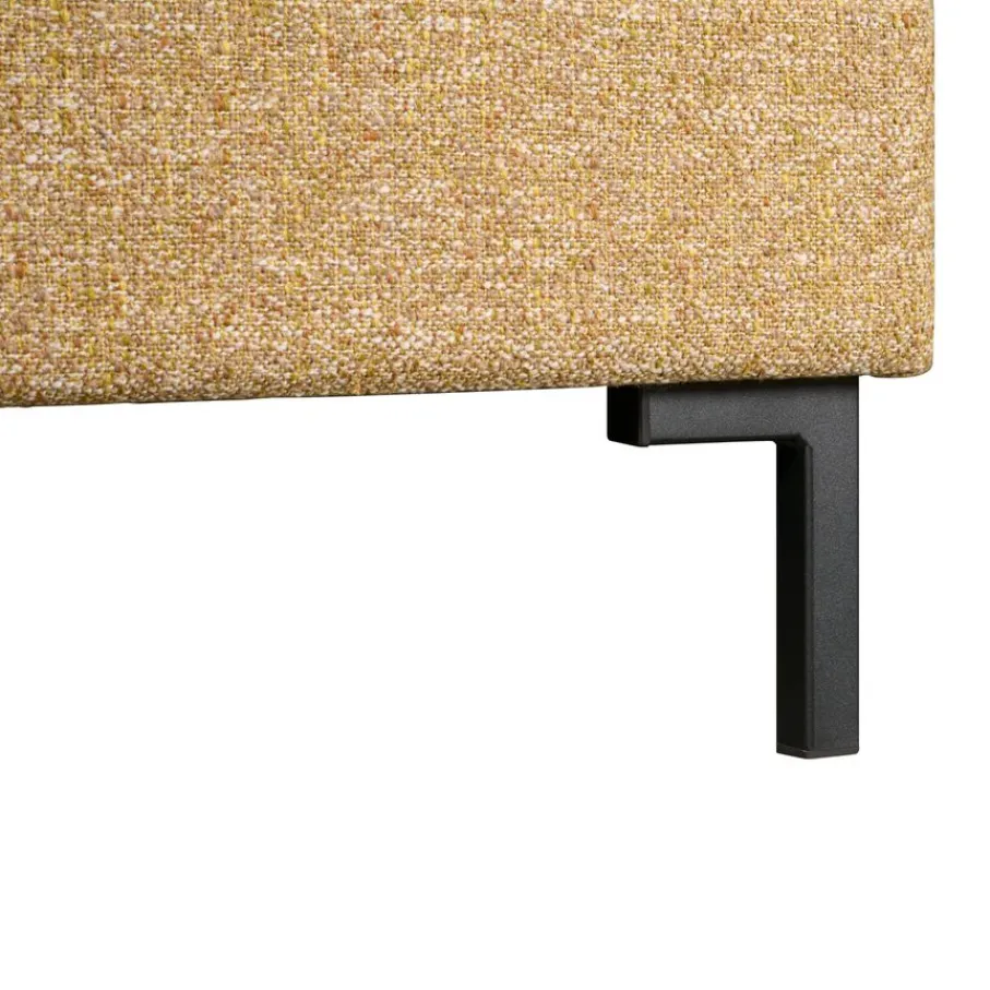 Hoekbank Brixton is bekleed met stof Oasis, een mooie bouclé stof van 100% polyester. De stof heeft een robuuste structuur en een mooie gemêleerde okergele kleur. De losse rugkussens zijn aan beide zijden volledig gestoffeerd. We adviseren om ze regelmatig te keren, voor een duurzaam gebruik.