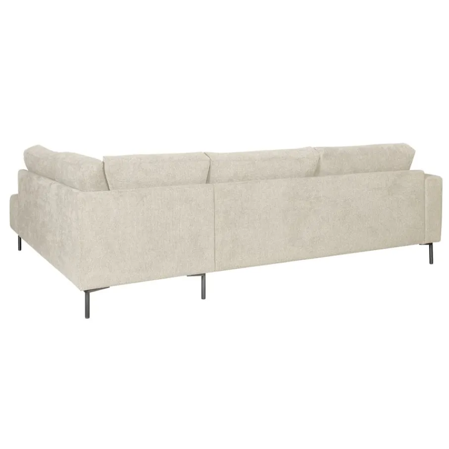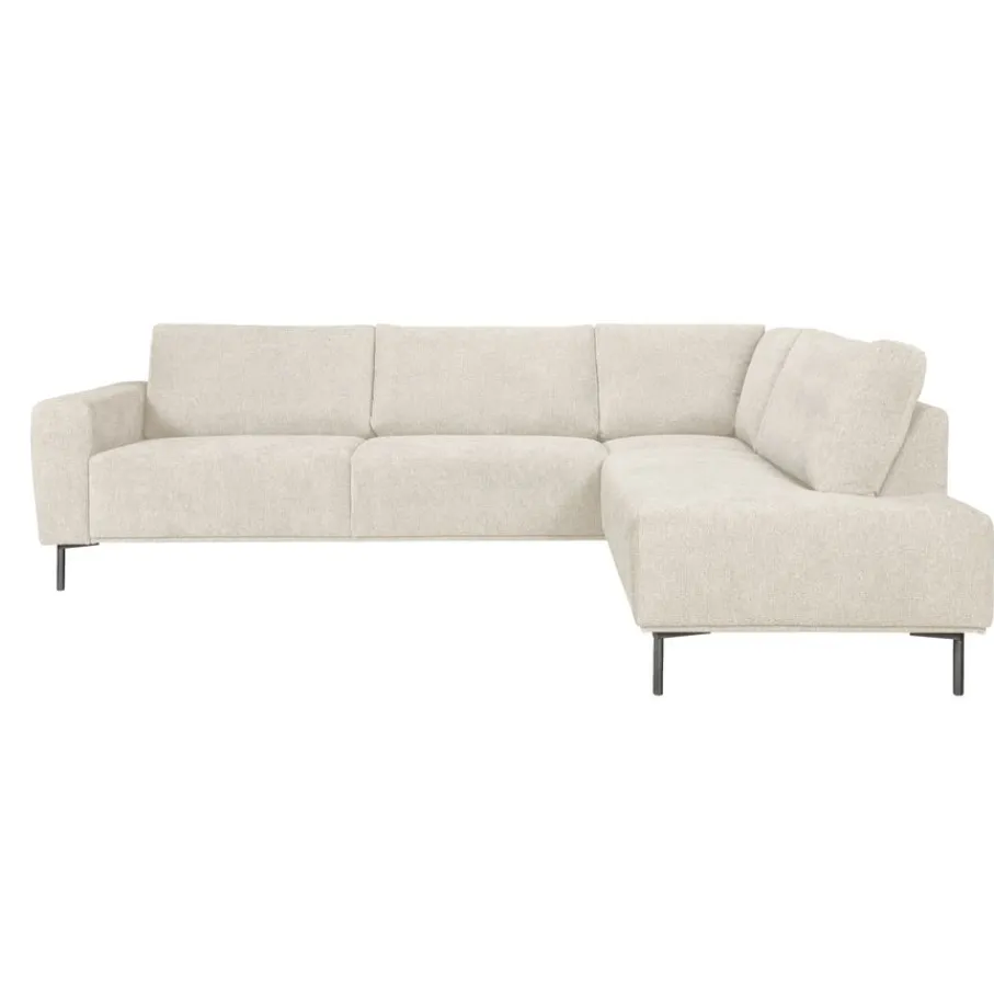 Hoekbank Deventer wordt als pakket geleverd en vereist nog eenvoudige montage. De zwart metalen poten moeten nog gemonteerd worden, waarna de twee elementen met elkaar gekoppeld kunnen worden.