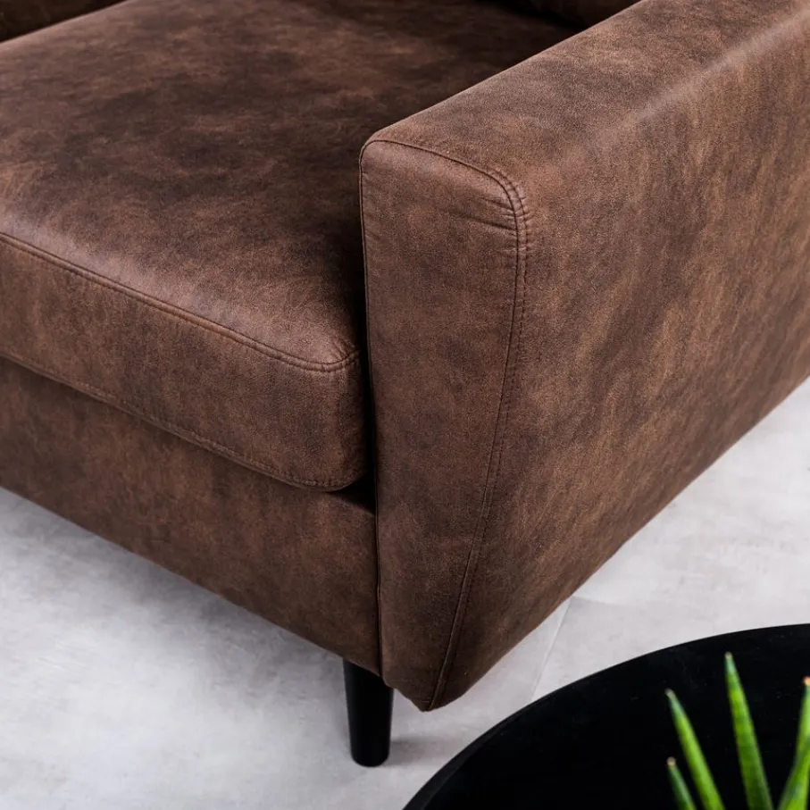 De bekleding van de Kinslee bank is stof Savannah. Deze microleder stof voelt zacht aan en zorgt voor zowel een robuuste, als luxe uitstraling. De bruine kleur is een tint die makkelijk combineert.