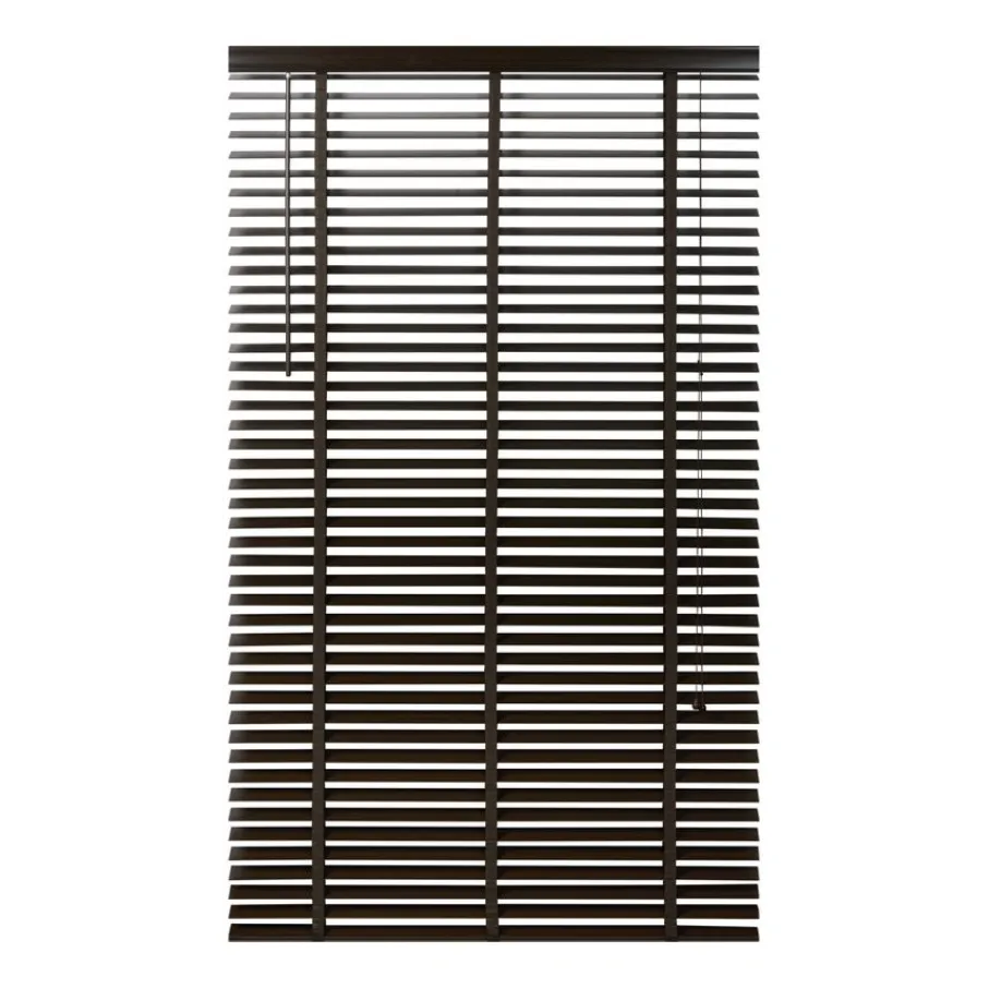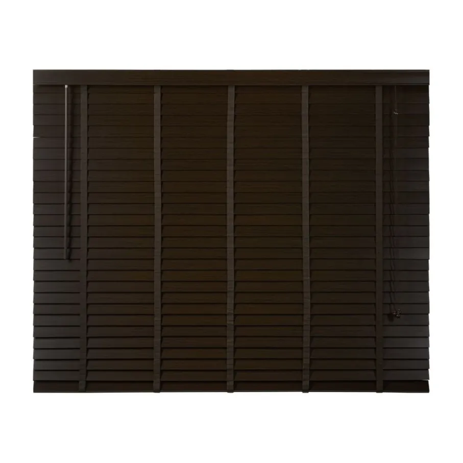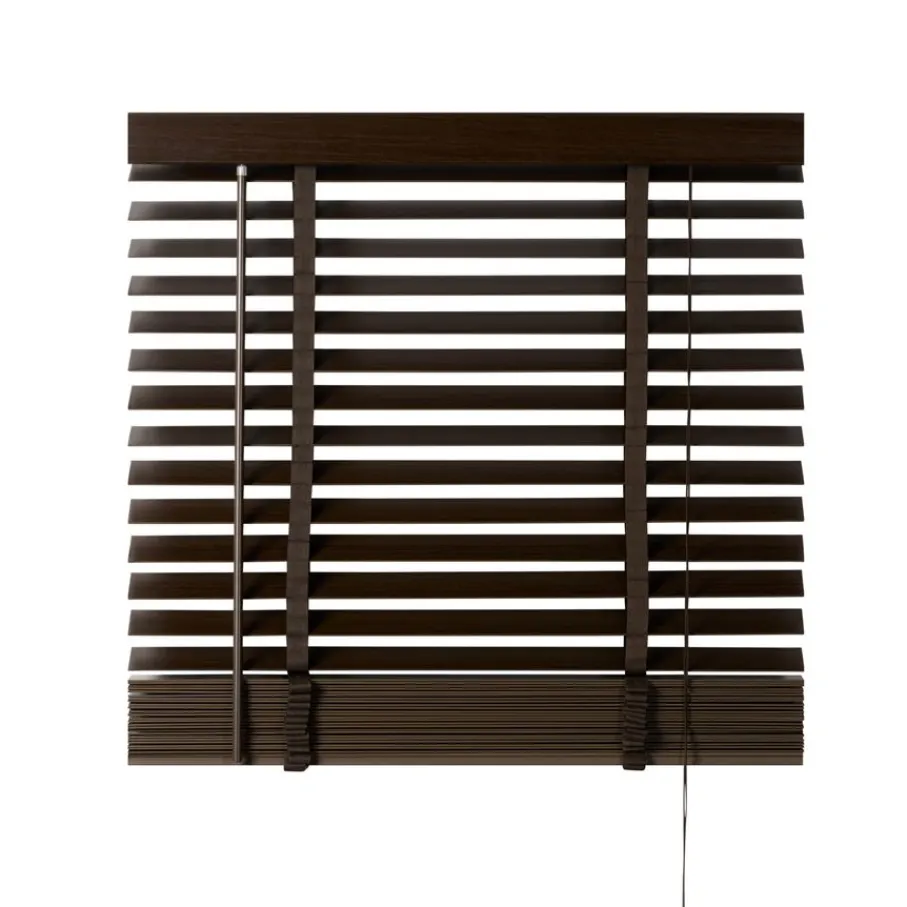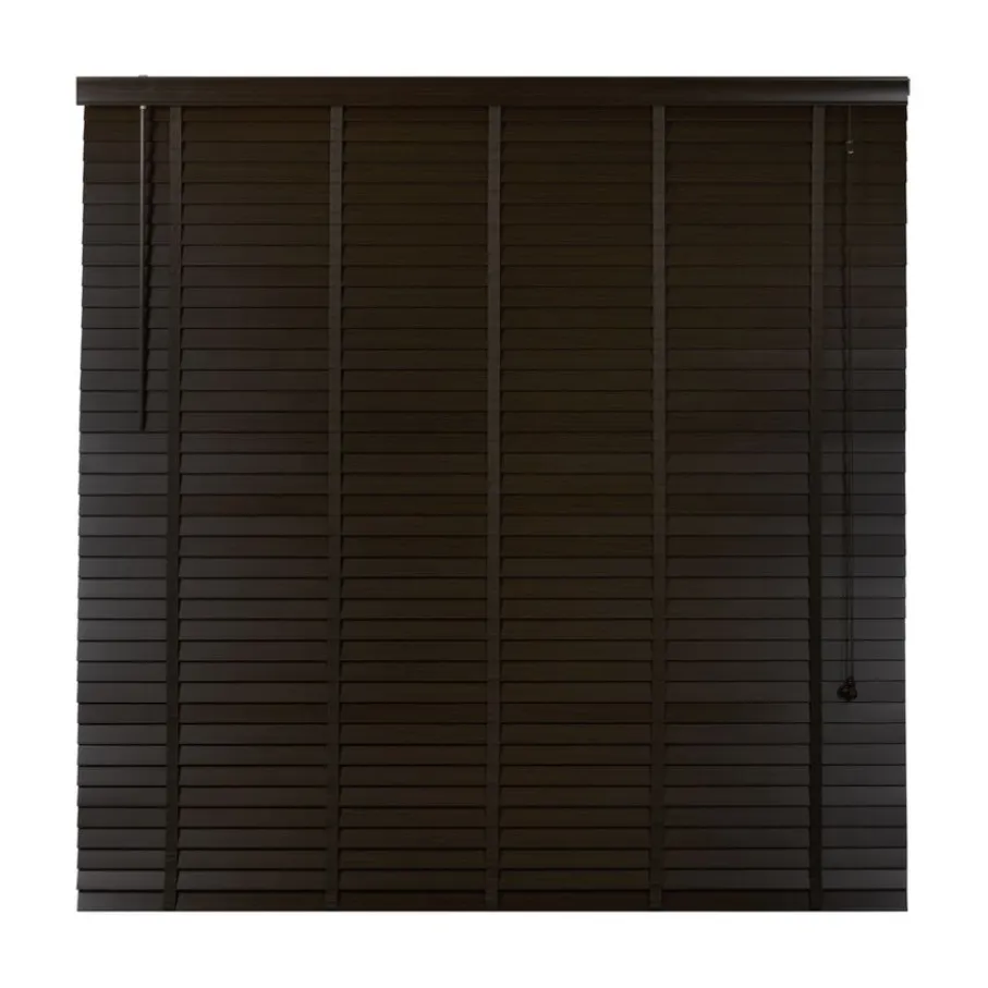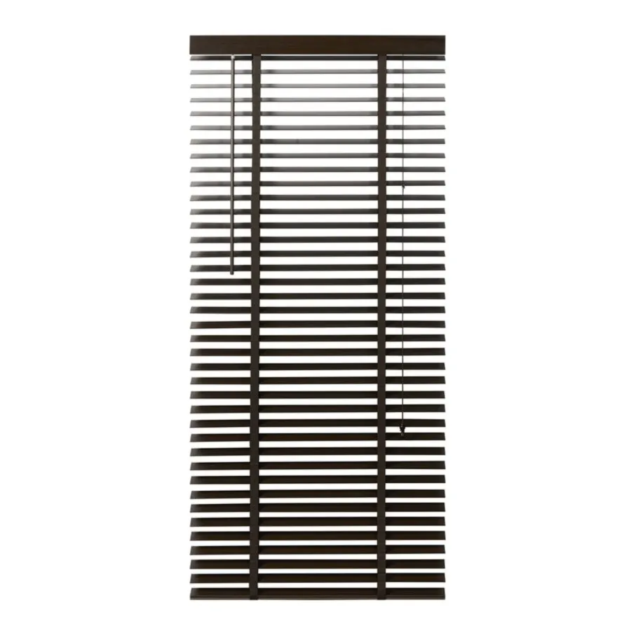 De lindehouten jaloezie heeft een donkerbruine kleur en lamellen van 50 mm. Ter afwerking zit er aan de bovenkant een afdeklat in dezelfde bruine kleur met luxe profiel. Ook de bedieningskoorden en verticale ladderbanden zijn in bijpassende bruine tint, waardoor de jaloezie volledig in dezelfde kleur is. Deze jaloezie is in veel meer standaardmaten leverbaar, perfect om met elkaar te combineren. Ook is de jaloezie er in zwart, wit en een naturel houtkleur.