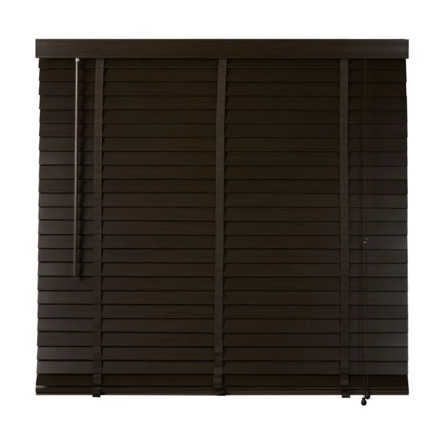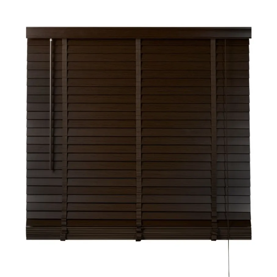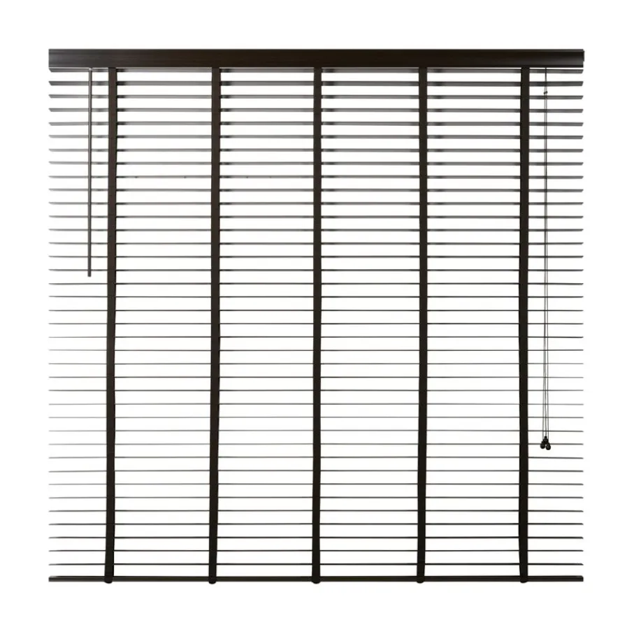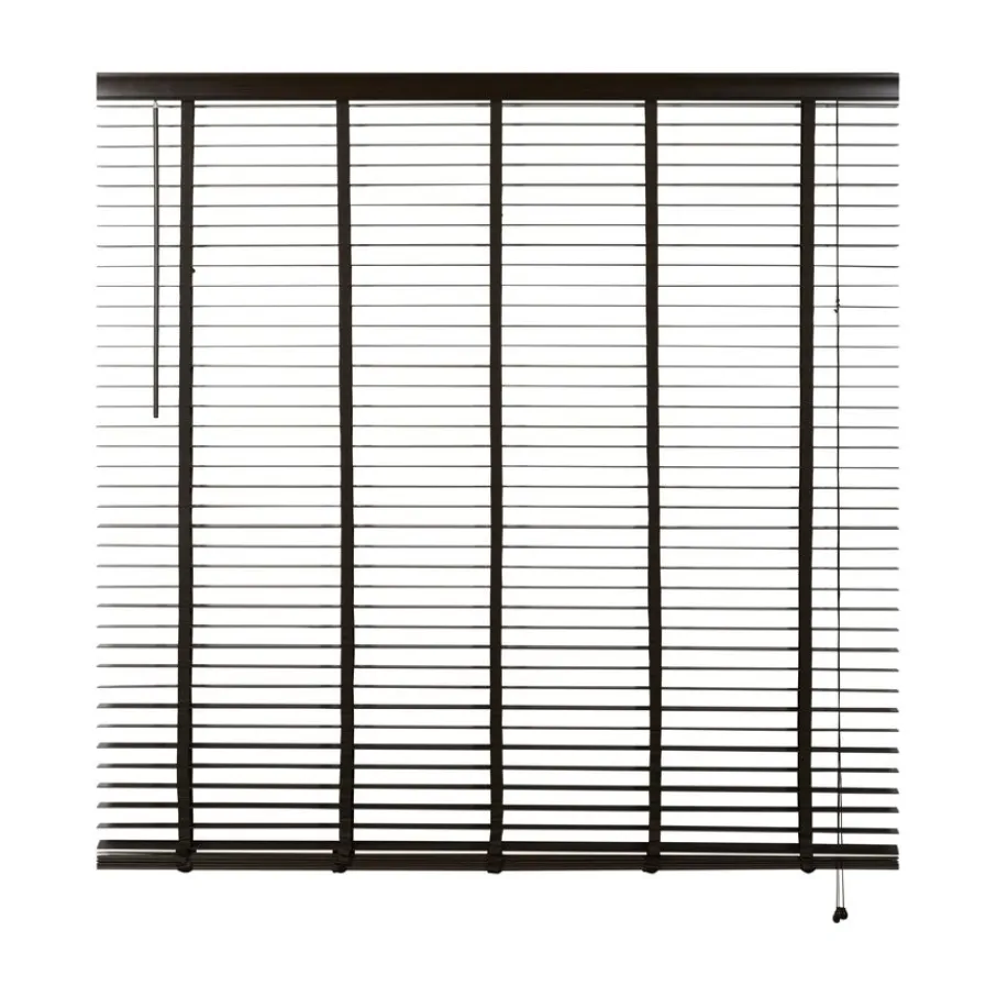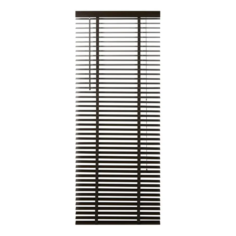 De lindehouten jaloezie heeft een donkerbruine kleur en lamellen van 50 mm. Ter afwerking zit er aan de bovenkant een afdeklat in dezelfde bruine kleur met luxe profiel. Ook de bedieningskoorden en verticale ladderbanden zijn in bijpassende bruine tint, waardoor de jaloezie volledig in dezelfde kleur is. Deze jaloezie is in veel meer standaardmaten leverbaar, perfect om met elkaar te combineren. Ook is de jaloezie er in zwart, wit en een naturel houtkleur.