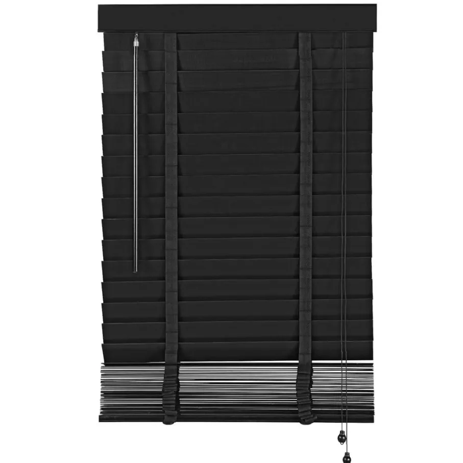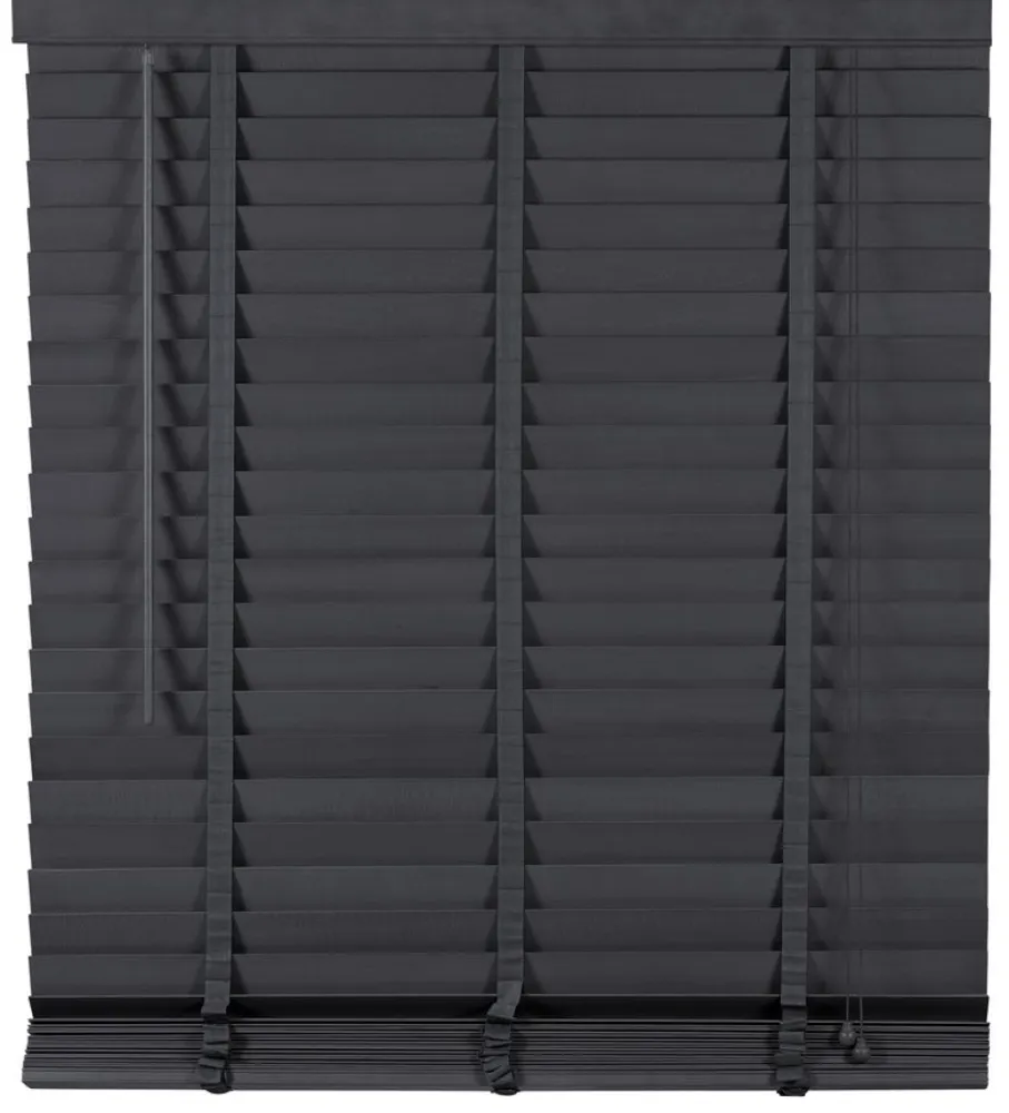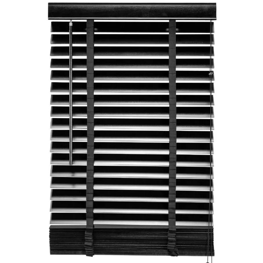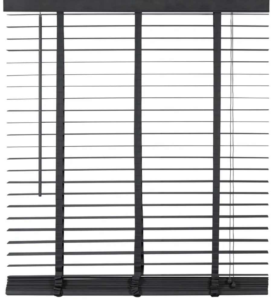 De zwarte houten jaloezie heeft een gladde structuur zonder houtnerf. De bovenkant bestaat uit een aluminium cassette met een zwarte afdeklat van MDF met een luxe profiel ter afwerking. Ook de bedieningskoorden en verticale ladderbanden zijn zwart, waardoor de jaloezie volledig in dezelfde zwarte kleur is. Deze ladderbanden hebben een fraaie geweven structuur.