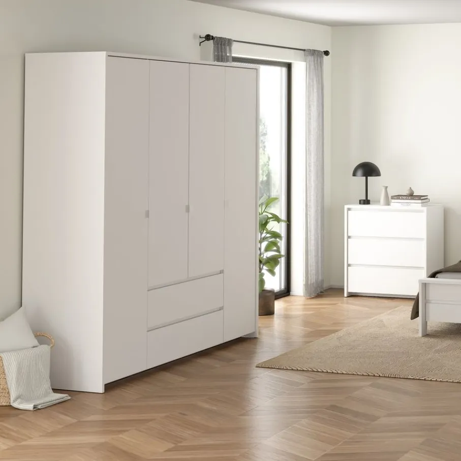 Atlanta is de perfecte opbergoplossing met 4 deuren en 2 brede lades. In de kast zitten 11 legplanken, waarvan 10 verstelbaar en één vast. Met een combinatie van hangruimte en legplanken biedt kledingkast Atlanta flexibele opbergmogelijkheden om je kleding georganiseerd en toegankelijk te houden.