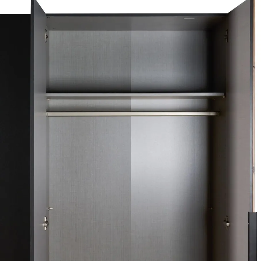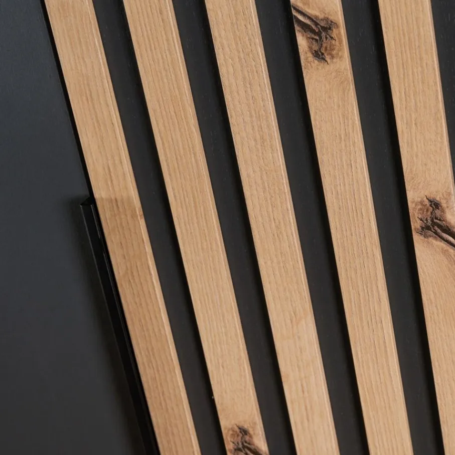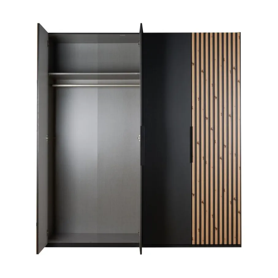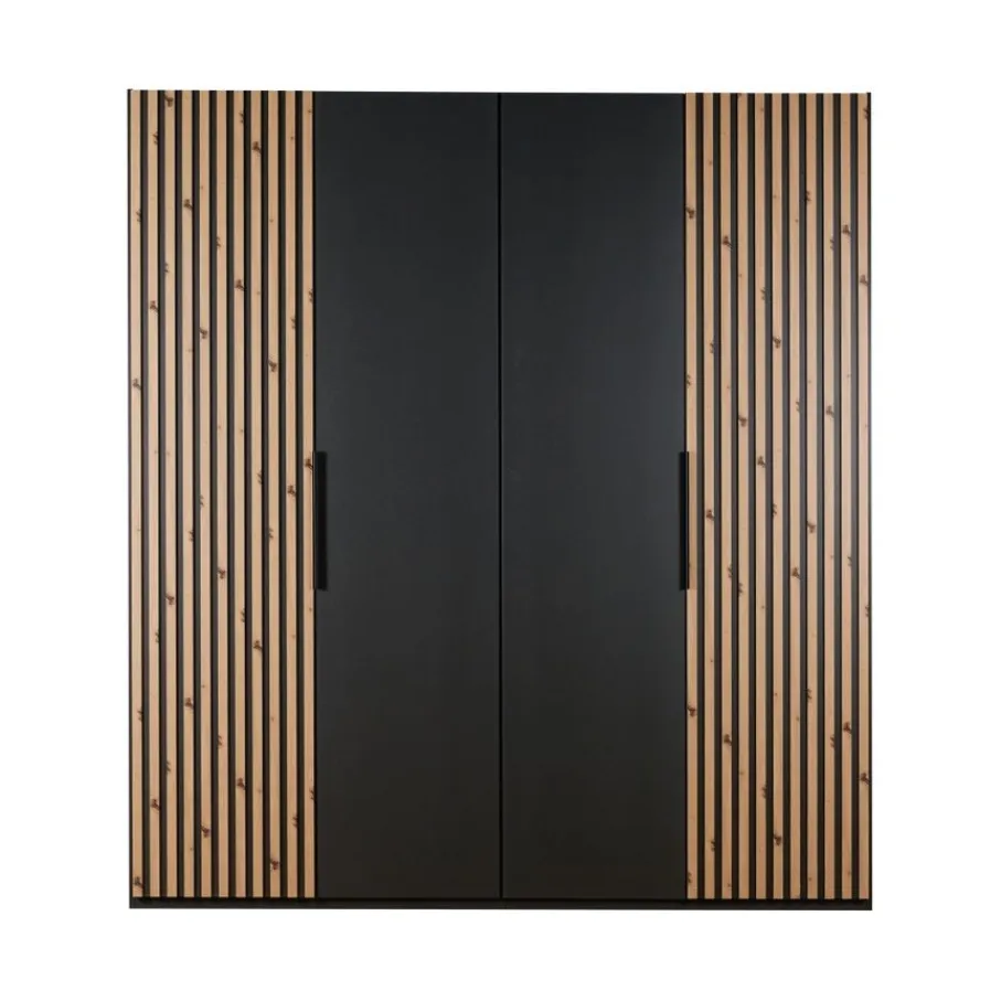 - Maak van je slaapkamer een stijlvolle oase met deze kledingkast die direct de aandacht trekt dankzij het unieke lattenlook decor en de elegante grafietgrijze afwerking.