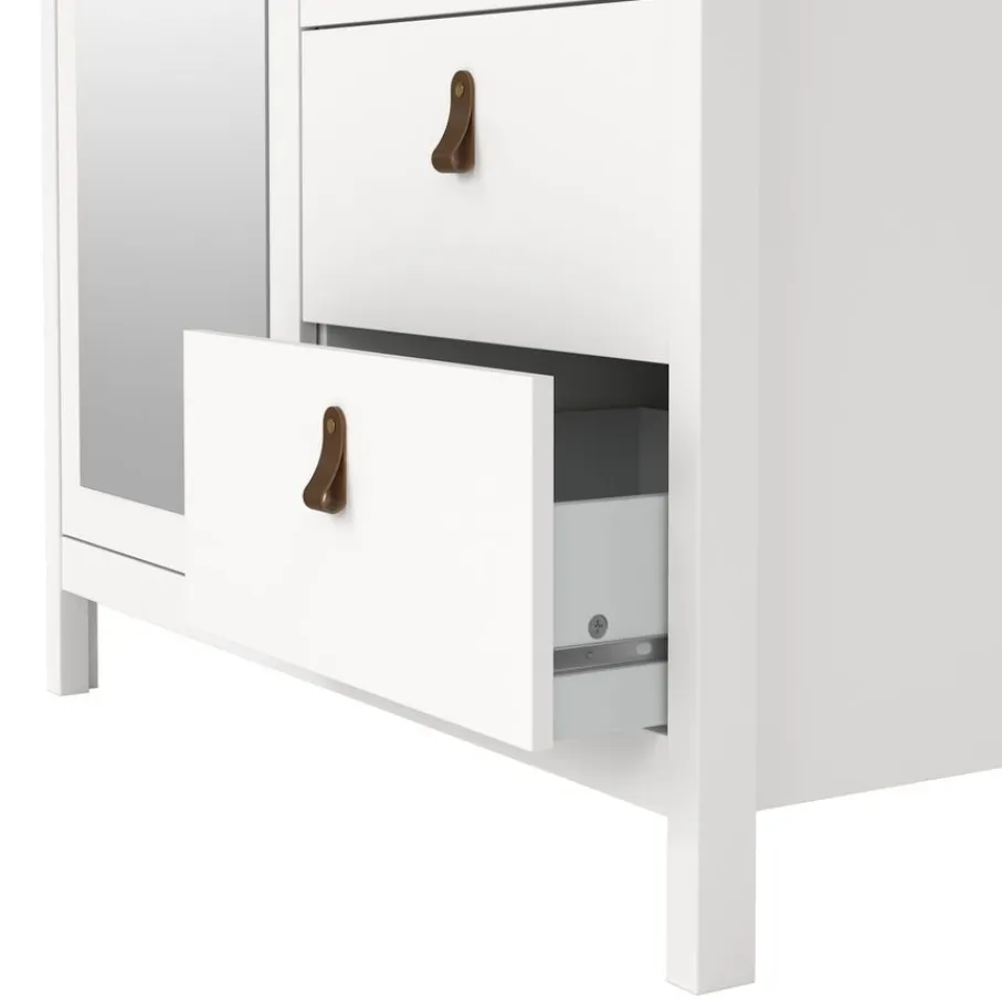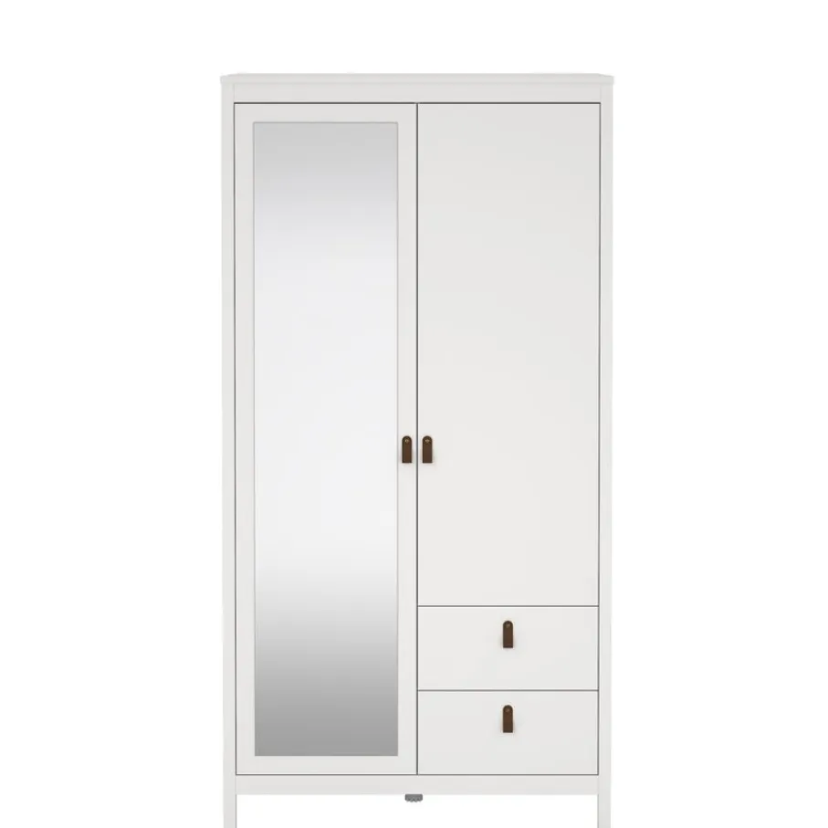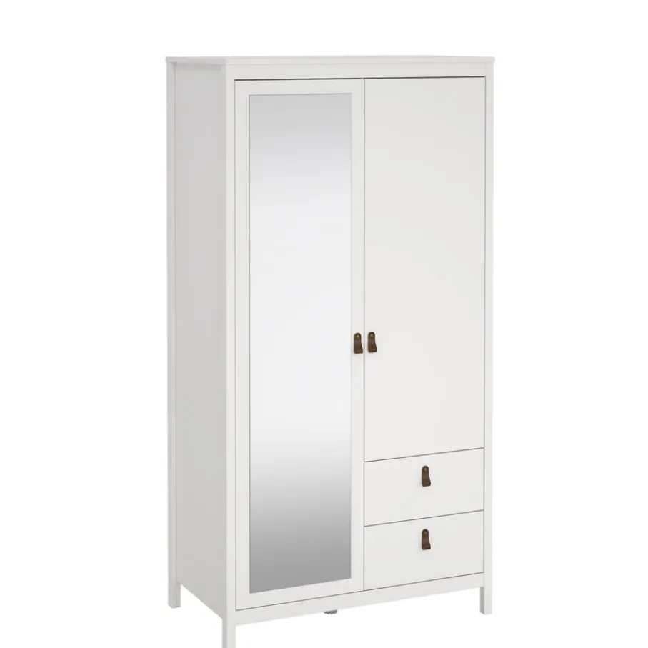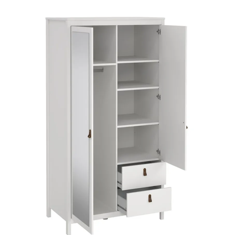 Kledingkast Dallas heeft 2 draaideuren, waarvan de linker er een spiegel op heeft. Rechts onderaan zitten 2 handige lades, perfect om kleine items in op te bergen. Het interieur bevat 2 vaste legplanken en 3 verstelbare planken. Ook is er een roede voor hangkleding.