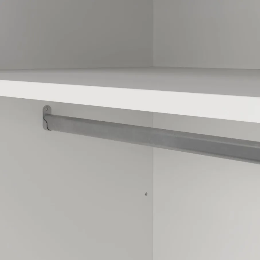 Kledingkast Dallas heeft 3 draaideuren. Links zit een breed vak met een vaste plank en roede erin. Rechts zit een smaller vak met één vaste en 2 verstelbare legplanken.