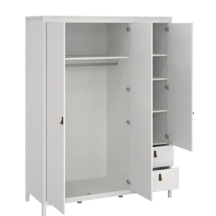 Kledingkast Dallas heeft 3 draaideuren, waarvan de middelste er een spiegel op heeft. Links zit een breed vak met een vaste plank en roede erin. Rechts zit een smaller vak met één vaste en 2 verstelbare legplanken. Daaronder zitten 2 handige lades, perfect om kleine items in op te bergen.
